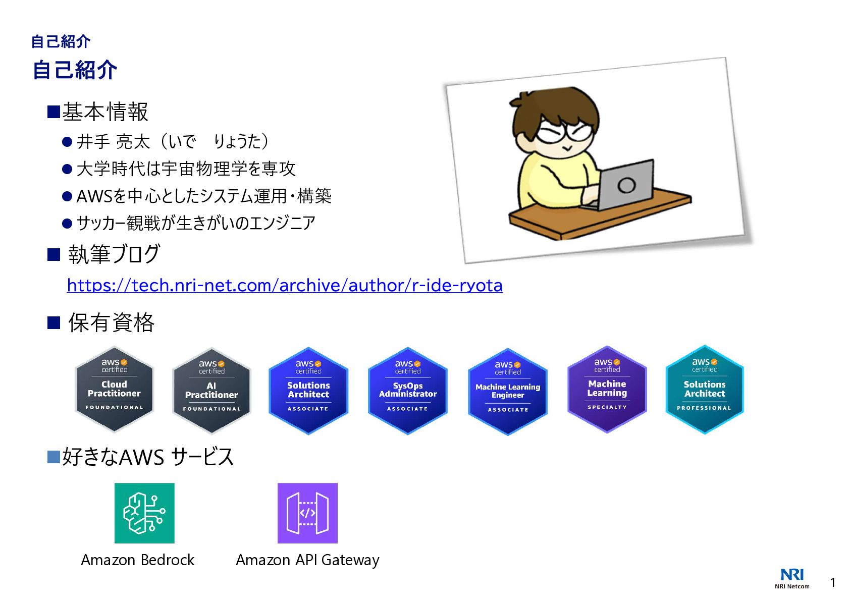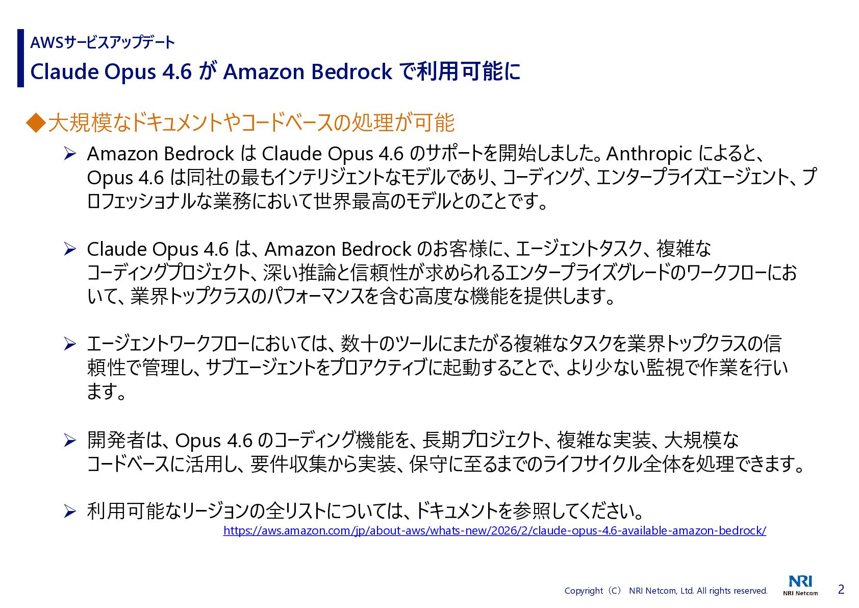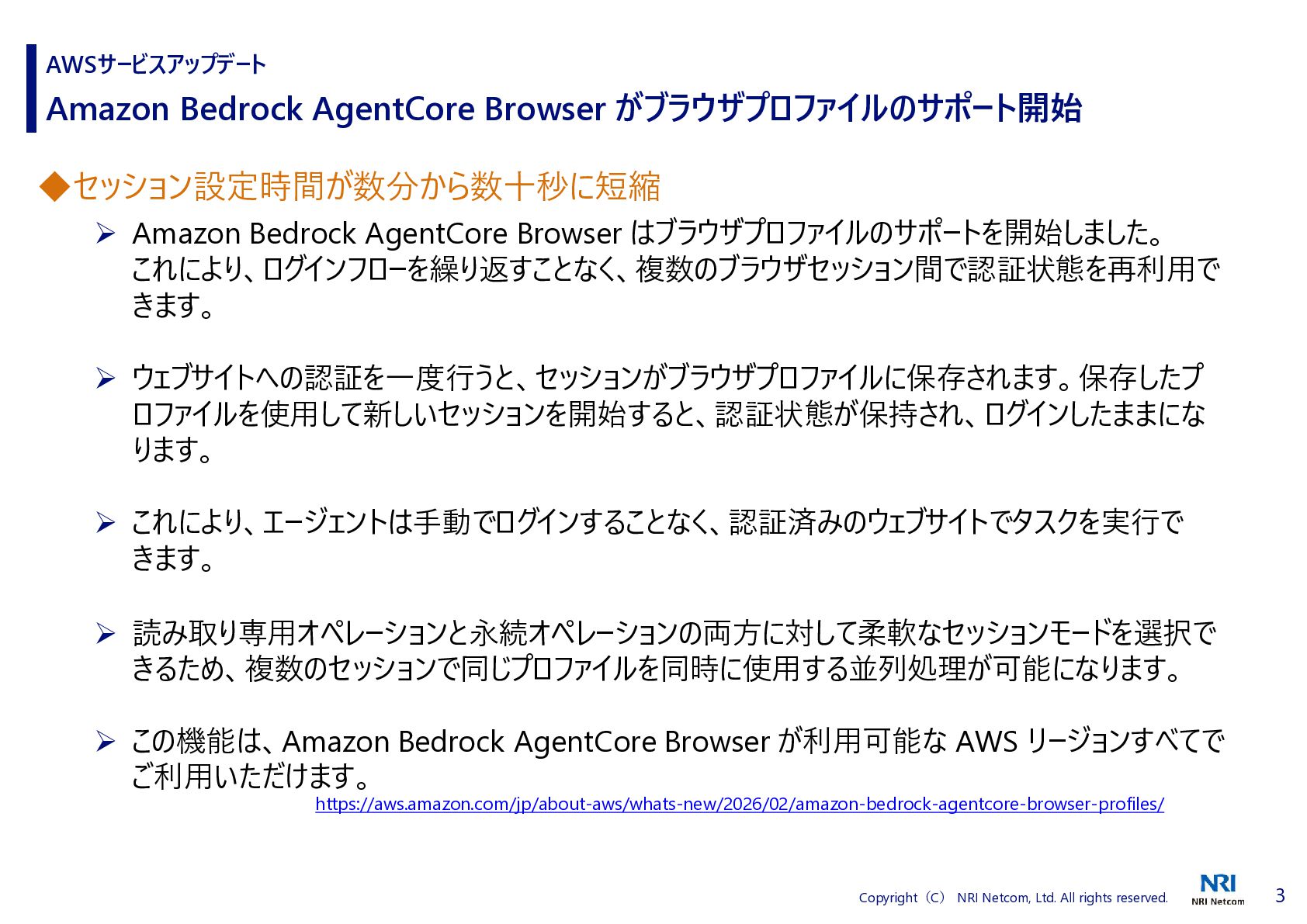 1 Copyright(C) NRI Netcom, Ltd. All rights reserved. AWSサービスアップデート ◆1 つのプロンプトでプロトタイプから本番環境にすばやく移行 AWS は、AWS MCP サーバーで利用可能な標準作業手順 (SOP) のデプロイを発表しました。 SOP は構造化された自然言語による指示であり、AI エージェントが複雑な複数ステップのタスクを 実行できるように導き、一貫性があって信頼できる効率的な動作を保証します。 これらを使用すると、お客様は任意の MCP 互換の IDE または CLI からの自然言語プロンプトを 使用してウェブアプリケーションを自分の AWS アカウントにデプロイできます。 デプロイは、AWS CDK インフラストラクチャを生成し、CloudFormation スタックをデプロイし、推 奨される AWS セキュリティベストプラクティスを使用して CI/CD パイプラインを作成することで機 能します。 Agent SOPs は、米国東部 (バージニア北部) リージョンで AWS MCP サーバーの一部として 追加費用なしでプレビュー版としてご利用いただけます。 https://aws.amazon.com/jp/about-aws/whats-new/2025/01/aws-announces-deployment-agent-sops-in-aws-mcp-server-preview/