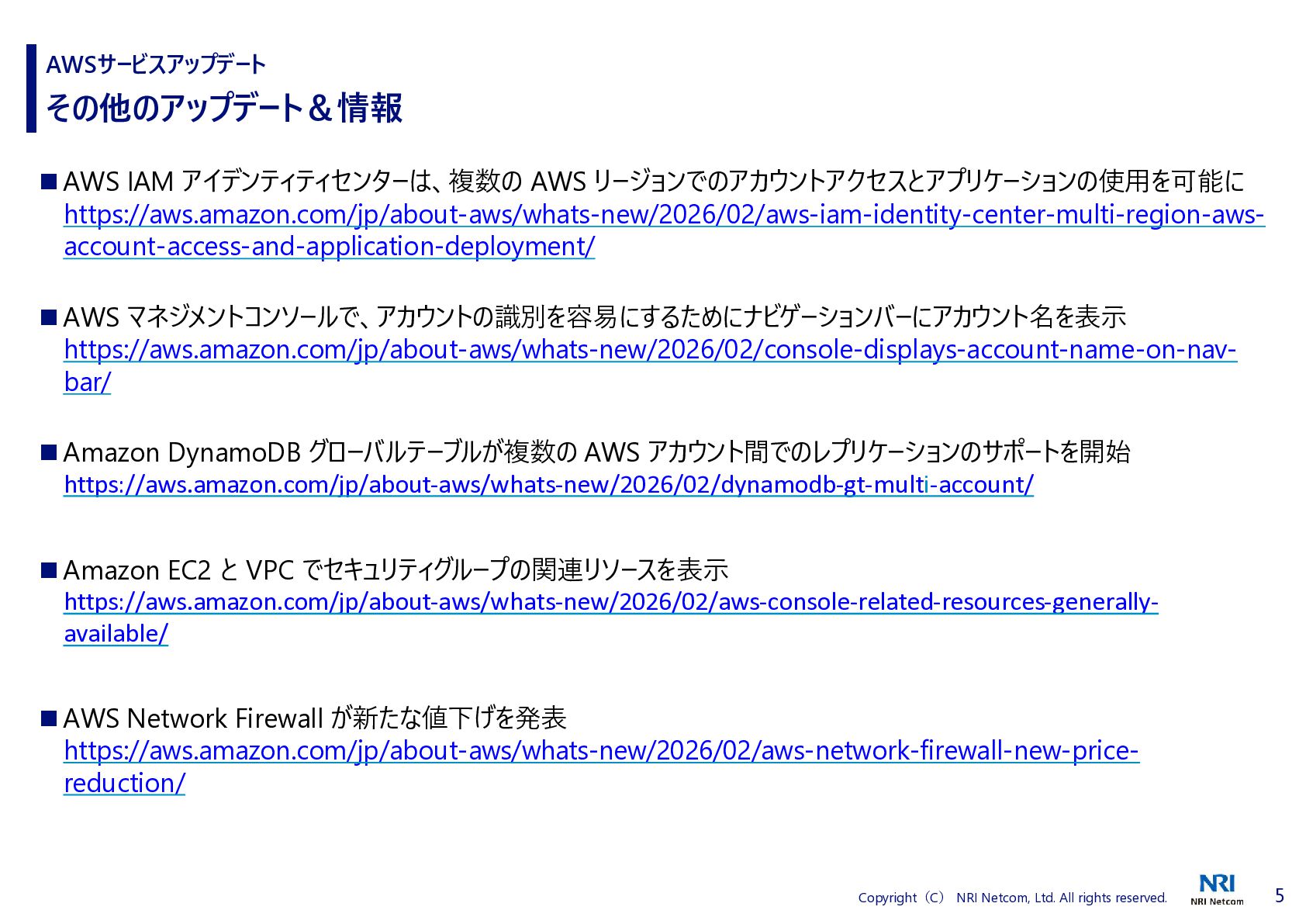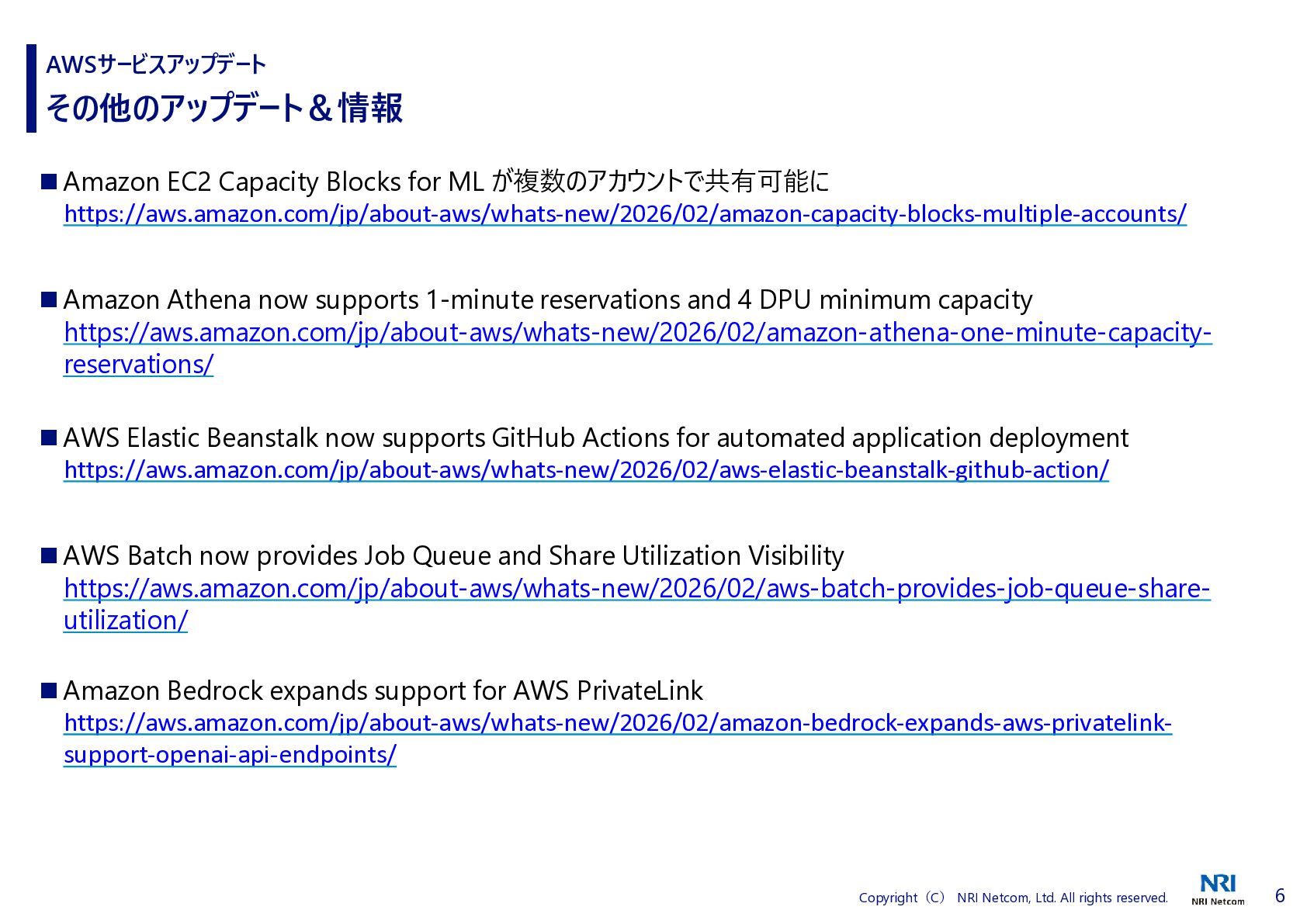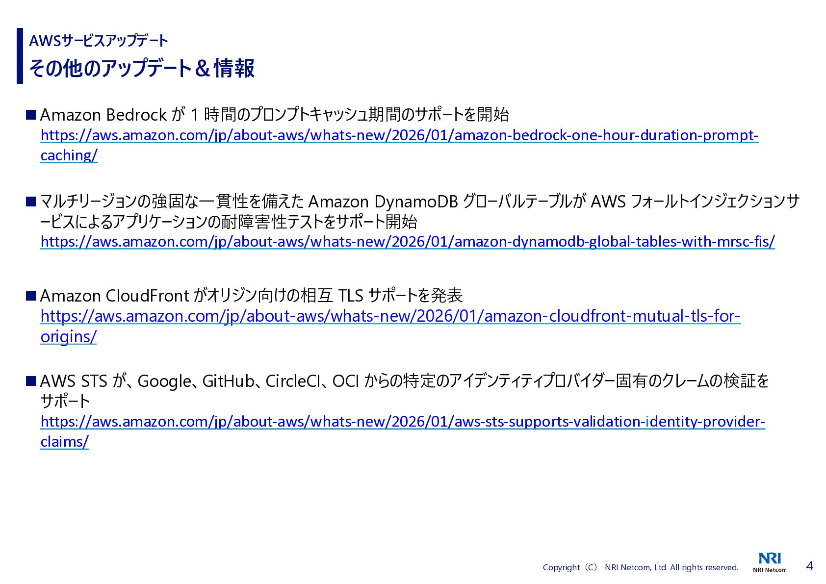 1 Copyright(C) NRI Netcom, Ltd. All rights reserved. AWSサービスアップデート ◆1 つのプロンプトでプロトタイプから本番環境にすばやく移行 AWS は、AWS MCP サーバーで利用可能な標準作業手順 (SOP) のデプロイを発表しました。 SOP は構造化された自然言語による指示であり、AI エージェントが複雑な複数ステップのタスクを 実行できるように導き、一貫性があって信頼できる効率的な動作を保証します。 これらを使用すると、お客様は任意の MCP 互換の IDE または CLI からの自然言語プロンプトを 使用してウェブアプリケーションを自分の AWS アカウントにデプロイできます。 デプロイは、AWS CDK インフラストラクチャを生成し、CloudFormation スタックをデプロイし、推 奨される AWS セキュリティベストプラクティスを使用して CI/CD パイプラインを作成することで機 能します。 Agent SOPs は、米国東部 (バージニア北部) リージョンで AWS MCP サーバーの一部として 追加費用なしでプレビュー版としてご利用いただけます。 https://aws.amazon.com/jp/about-aws/whats-new/2025/01/aws-announces-deployment-agent-sops-in-aws-mcp-server-preview/