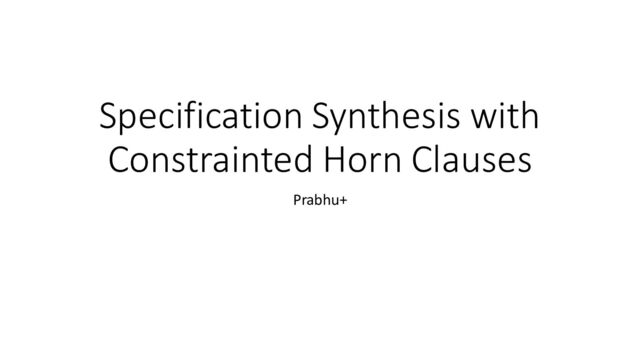 at a private reading seminar where every attendee picks one paper from PLDIʼ21 and explains its gist to the audience. • The copyrights of pictures shown in the remaining slides are, when no explicit notes are given, attributed to the authors of the paper [Prabhu+ PLDIʼ21]. • I took some exact slides from the pdf for the oral presentation of the paper. [1] • I have some background but am not an expert, so Iʼm not 100% sure about what I think I grasped. Please contact me if you find any false statements or misinterpretations. • [1] Specification Synthesis with Constrained Horn Clauses, Sumanth Prabhu S, PLDI 2021. https://fmindia.cmi.ac.in/update2021/slides/sumanth-fmupdate2021.pdf