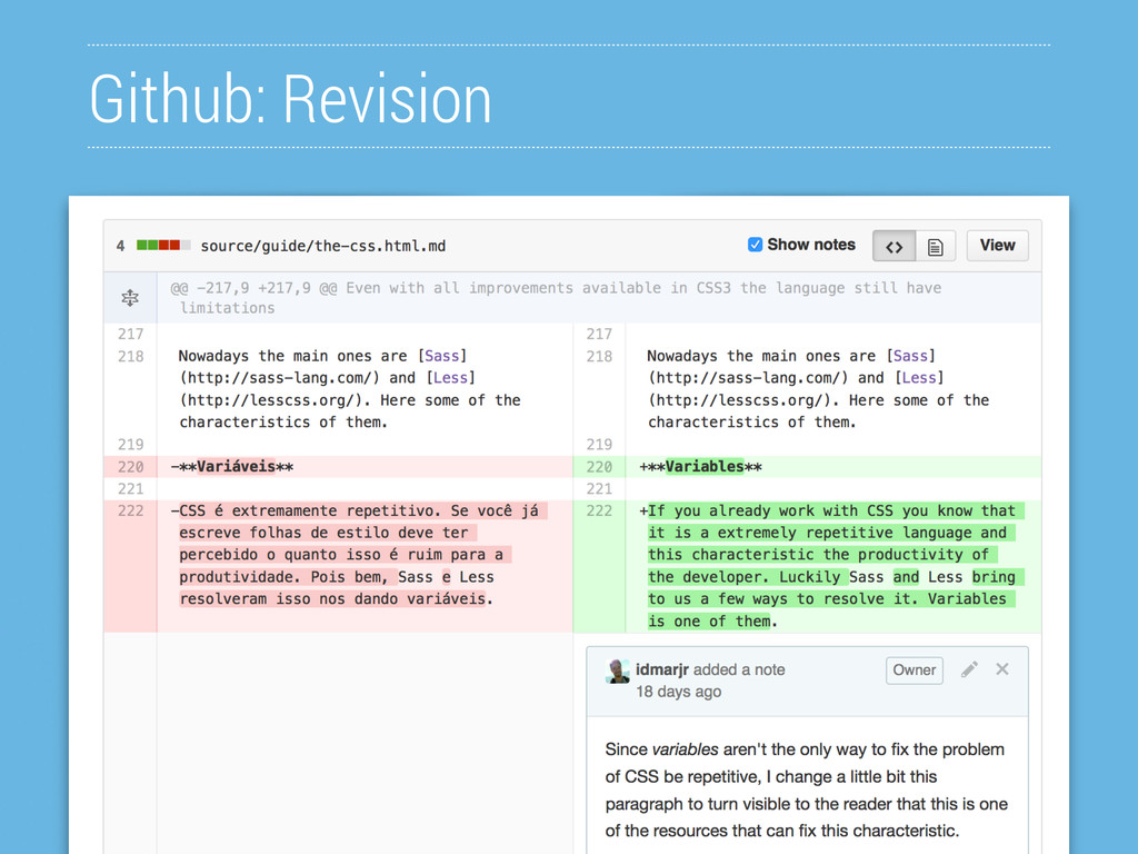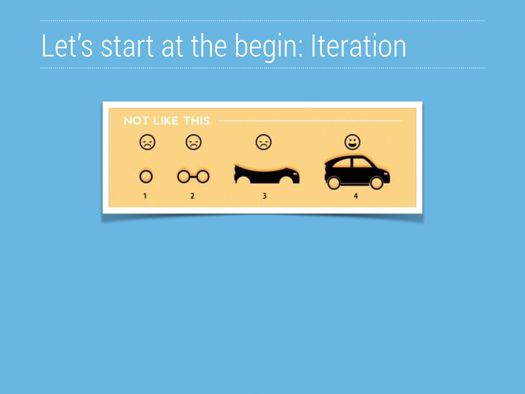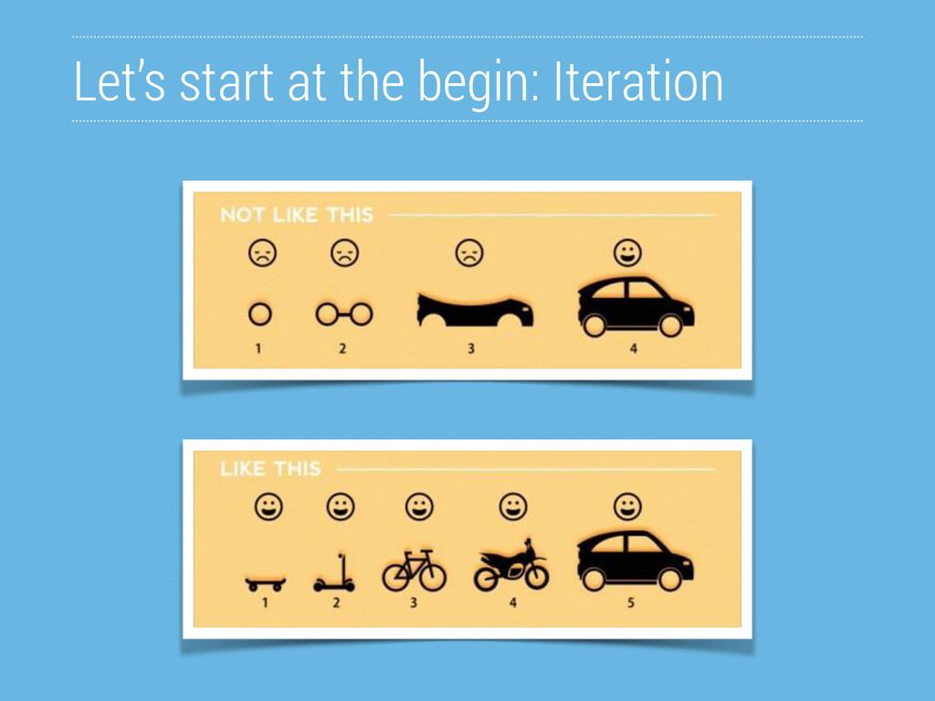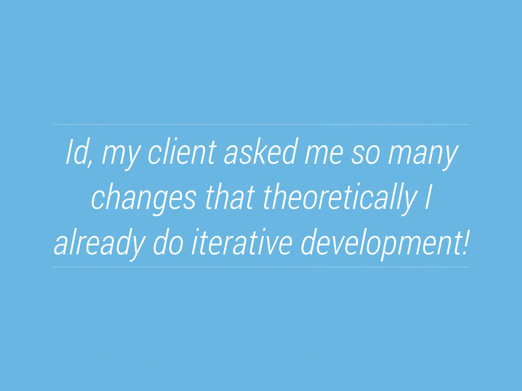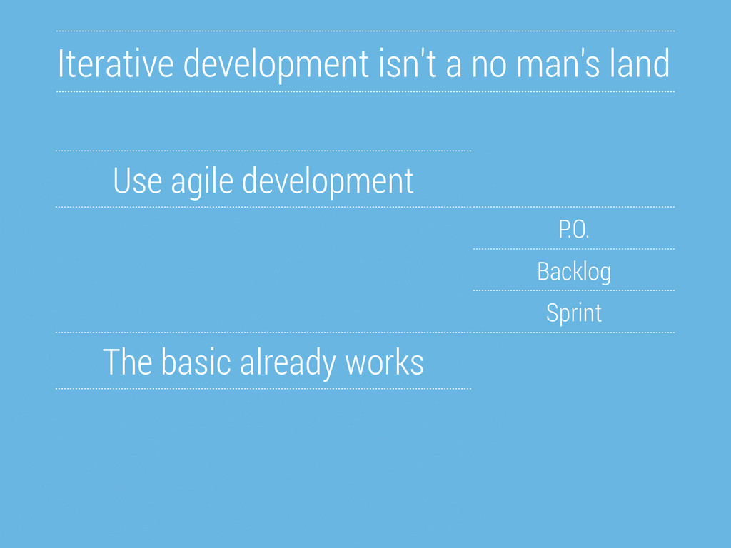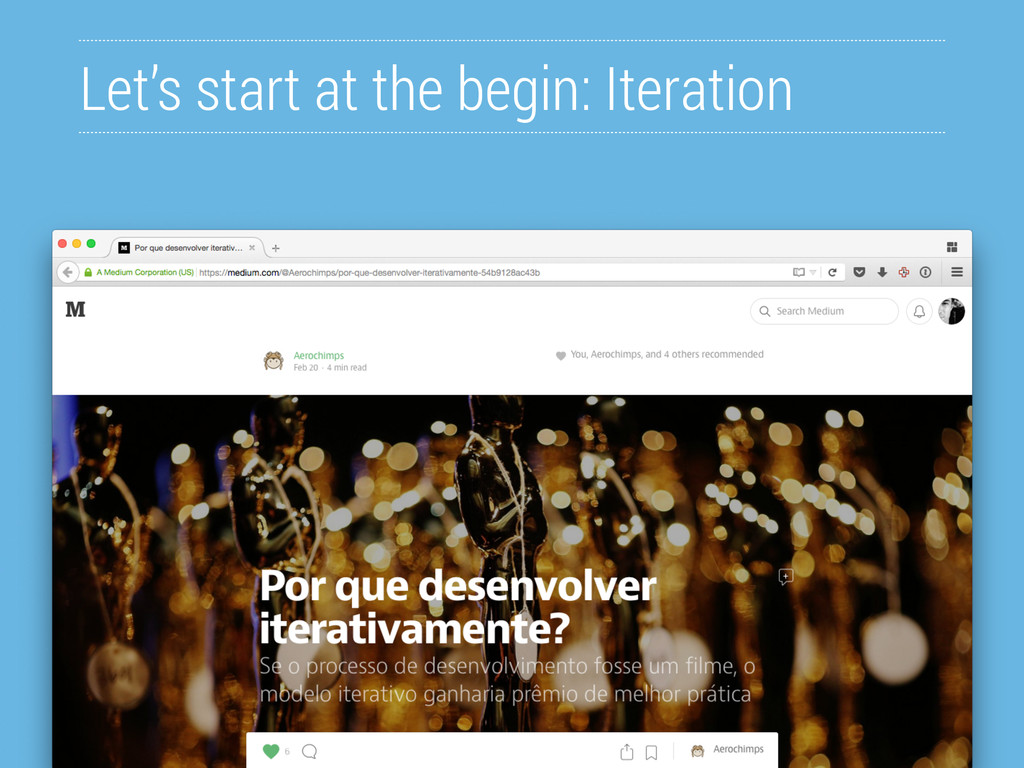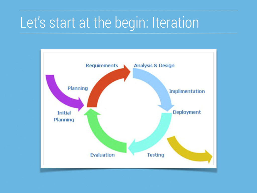 In this talk I explained shortly what is the concept behind the iterative development, how it helps teams to avoid unnecessary rework, organize a constant delivery flow and keep the product evolving. Briefly I speak about how get and analyze data to guide decisions of each iteration. To finish the talk I introduce some of the Github features that helps the teams during the iteration process (Mostly focused in Designers that aren't familiarized with git.).