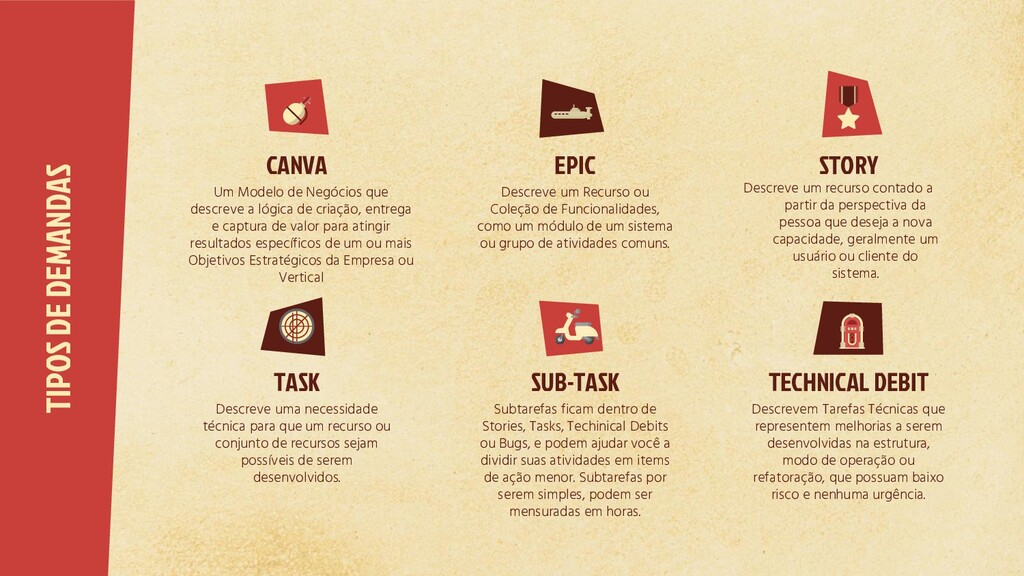 a lógica de criação, entrega e captura de valor para atingir resultados específicos de um ou mais Objetivos Estratégicos da Empresa ou Vertical EPIC Descreve um Recurso ou Coleção de Funcionalidades, como um módulo de um sistema ou grupo de atividades comuns. STORY Descreve um recurso contado a partir da perspectiva da pessoa que deseja a nova capacidade, geralmente um usuário ou cliente do sistema. TASK Descreve uma necessidade técnica para que um recurso ou conjunto de recursos sejam possíveis de serem desenvolvidos. SUB-TASK Subtarefas ficam dentro de Stories, Tasks, Techinical Debits ou Bugs, e podem ajudar você a dividir suas atividades em items de ação menor. Subtarefas por serem simples, podem ser mensuradas em horas. TECHNICAL DEBIT Descrevem Tarefas Técnicas que representem melhorias a serem desenvolvidas na estrutura, modo de operação ou refatoração, que possuam baixo risco e nenhuma urgência.