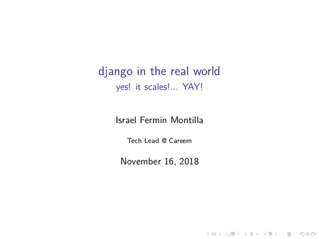 In this talk, I go through a series of recommendations to tweak and optimize your django projects when you need to scale, some practices that you should try before breaking everything into microservices, from the database, going through caching and finally few techniques to optimize the template layer.