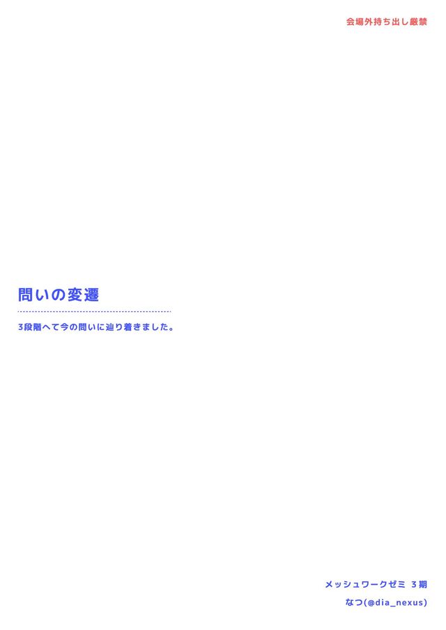 問いの変遷 3段階へて今の問いに辿り着きました。 会場外持ち出し厳禁 メッシュワークゼミ 3期 なつ(@dia_nexus)