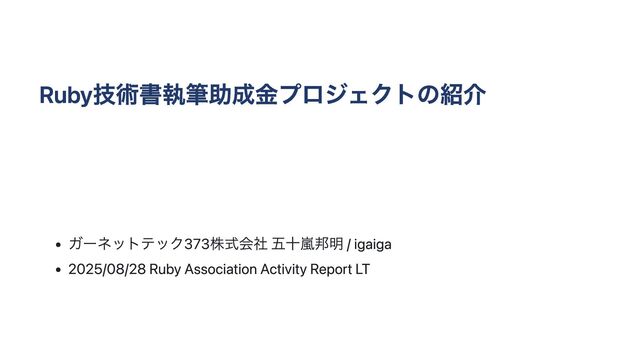 Ruby技術書執筆助成金プロジェクトの紹介 ガーネットテック373株式会社 五十嵐邦明 / igaiga 2025/08/28 Ruby Association Activity Report