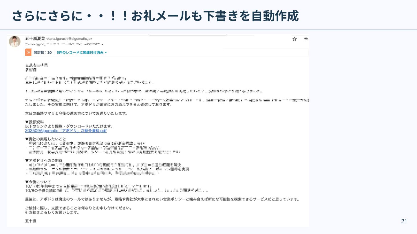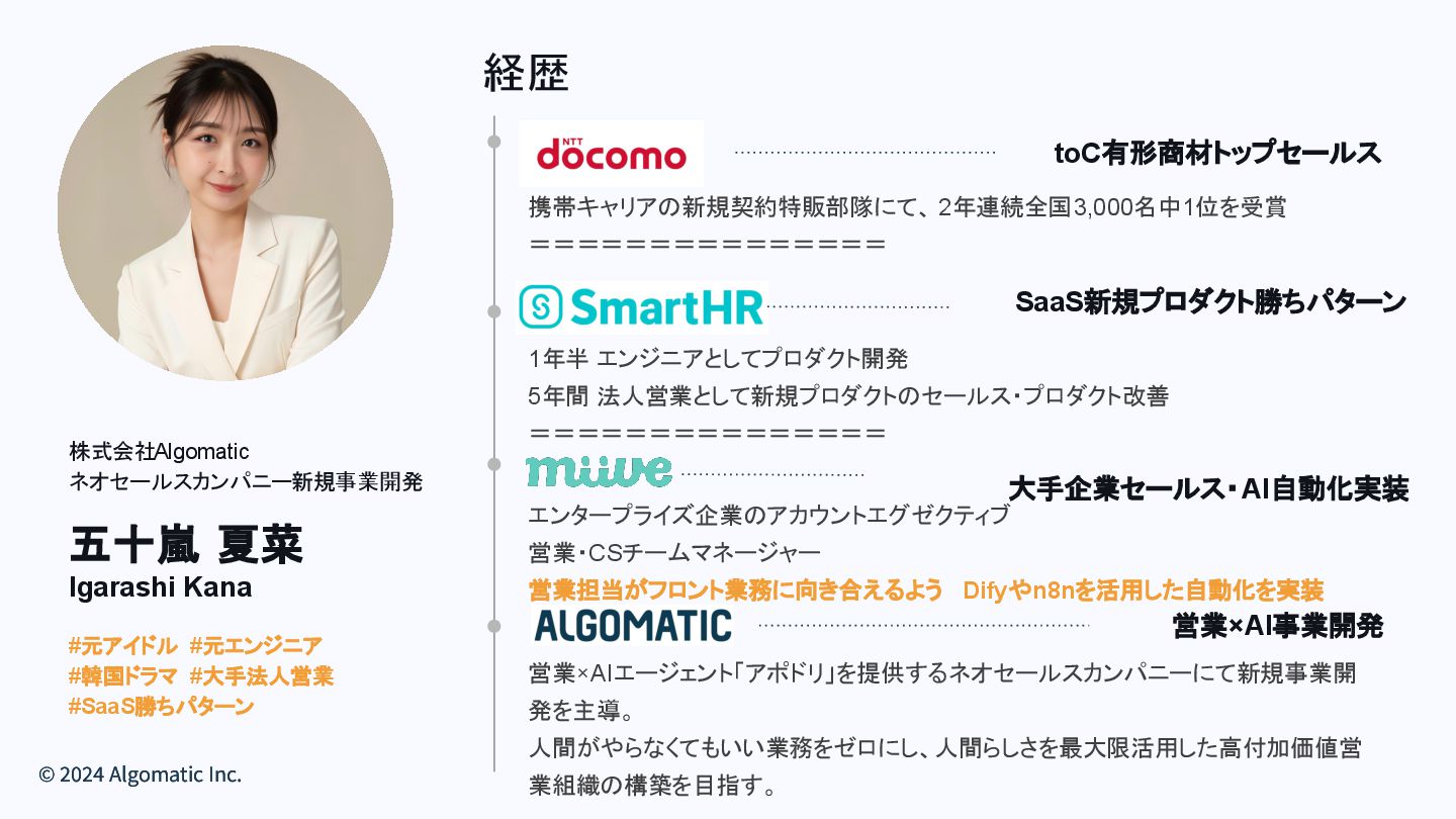 新規事業開発 五十嵐 夏菜 Igarashi Kana 経歴 #元アイドル #元エンジニア #韓国ドラマ #大手法人営業 #SaaS勝ちパターン toC有形商材トップセールス 携帯キャリアの新規契約特販部隊にて、 2年連続全国3,000名中1位を受賞 =============== 1年半 エンジニアとしてプロダクト開発 5年間 法人営業として新規プロダクトのセールス・プロダクト改善 =============== 営業×AI事業開発 営業×AIエージェント「アポドリ」を提供するネオセールスカンパニーにて新規事業開 発を主導。 人間がやらなくてもいい業務をゼロにし、人間らしさを最大限活用した高付加価値営 業組織の構築を目指す。 SaaS新規プロダクト勝ちパターン 大手企業セールス・AI自動化実装 エンタープライズ企業のアカウントエグゼクティブ 営業・CSチームマネージャー 営業担当がフロント業務に向き合えるよう Difyやn8nを活用した自動化を実装