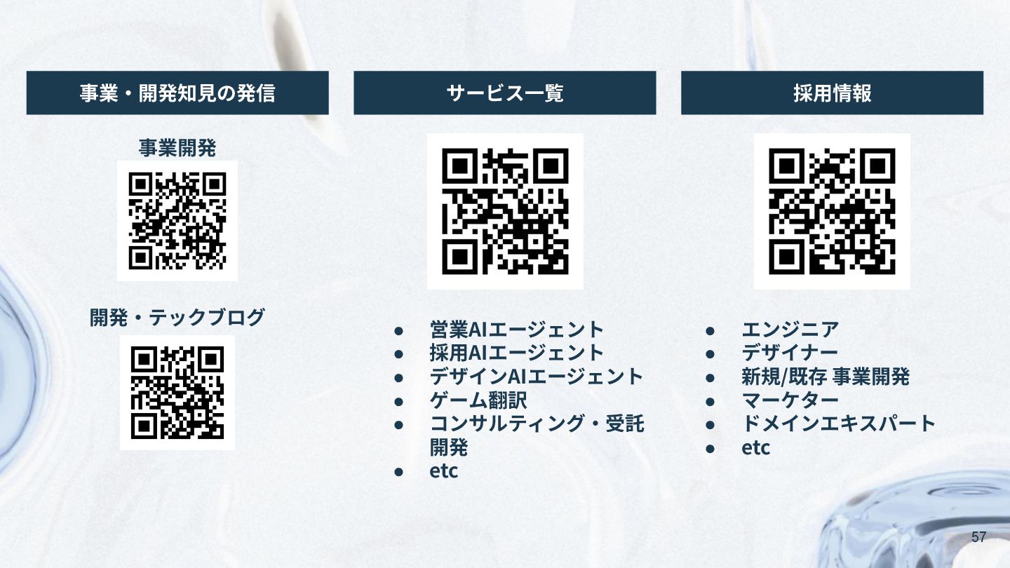 事業開発 • マーケター • ドメインエキスパート • etc • 営業AIエージェント • 採⽤AIエージェント • デザインAIエージェント • ゲーム翻訳 • コンサルティング‧受託 開発 • etc 事業開発 開発‧テックブログ