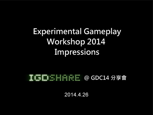 A quick walkthrough of Experimental Gameplay Workshop 2014 at GDC, given at IGDA Taiwan's post-GDC seminar on 2014/4/26.