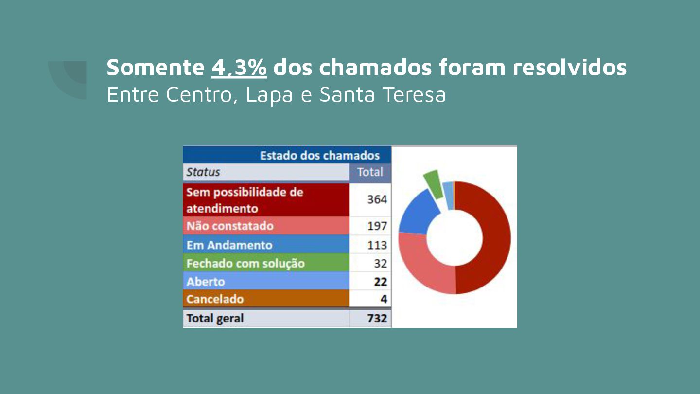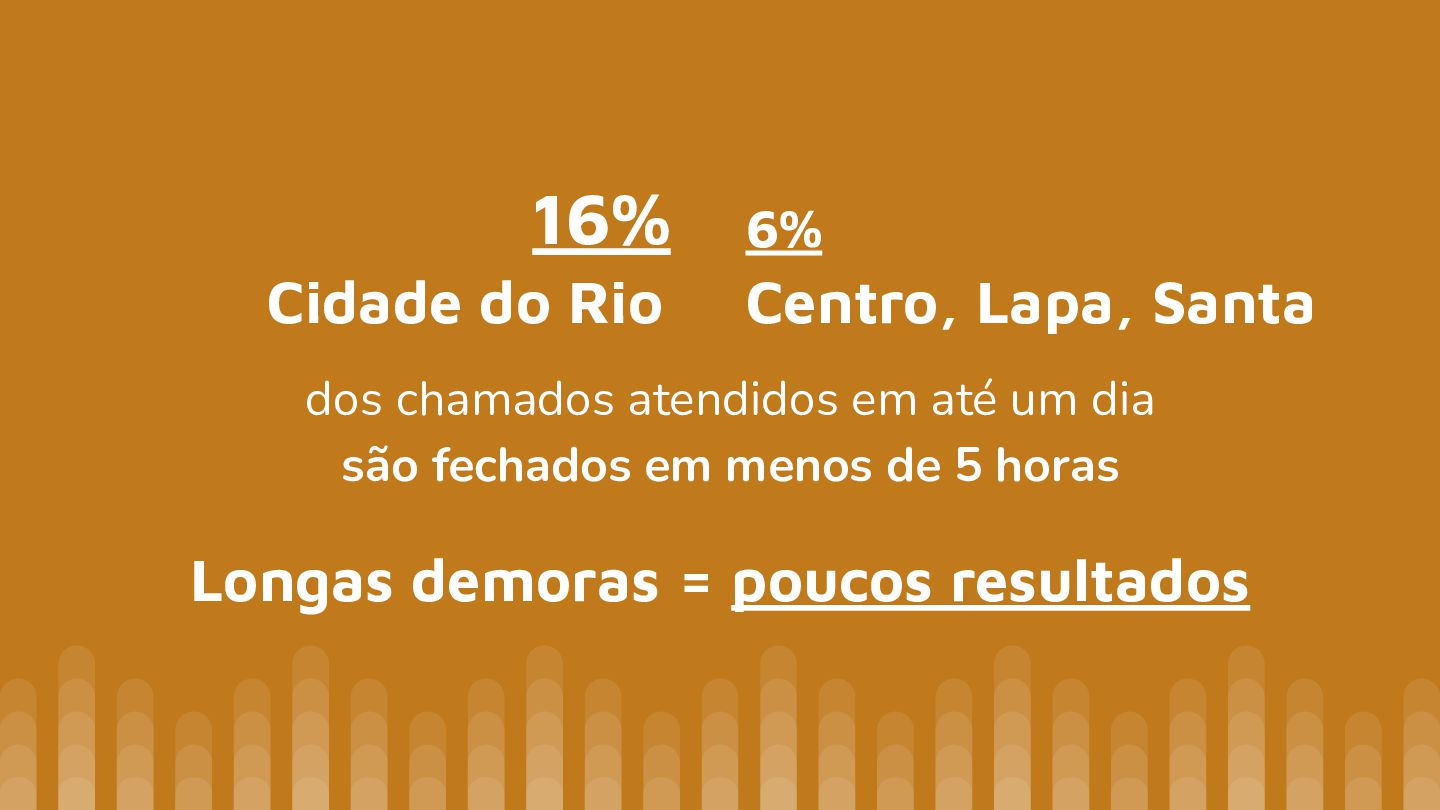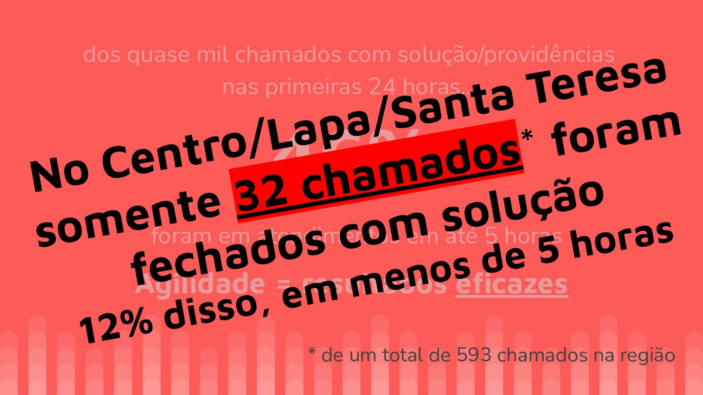 horas… Agilidade = resultados eficazes foram em atendimentos em até 5 horas No Centro/Lapa/Santa Teresa somente 32 chamados* foram fechados com solução 12% disso, em menos de 5 horas * de um total de 593 chamados na região