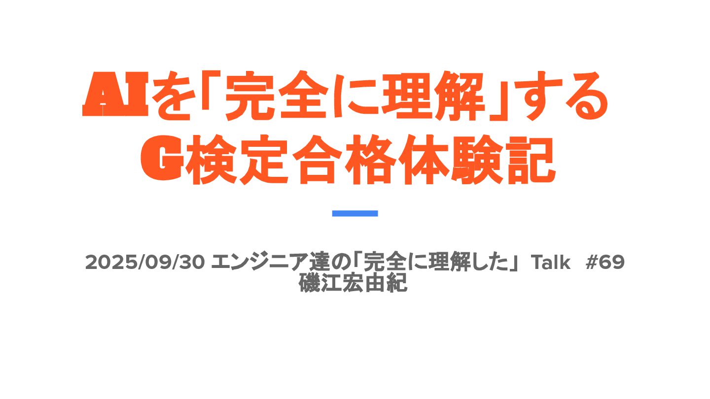 AIを「完全に理解」する G検定合格体験記 2025/09/30 エンジニア達の「完全に理解した」 Talk #69 磯江宏由紀