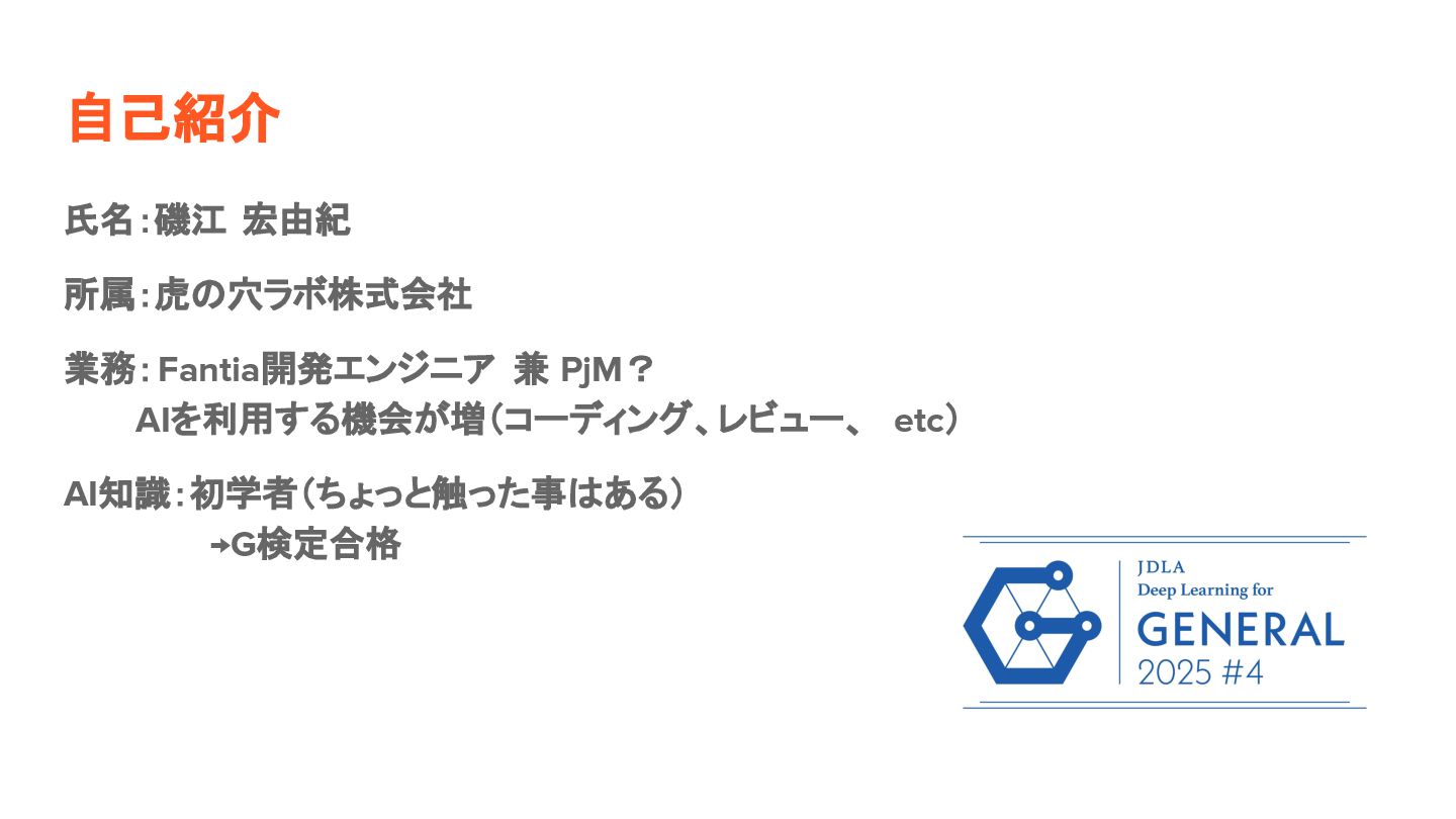 自己紹介 氏名:磯江 宏由紀 所属:虎の穴ラボ株式会社 業務:Fantia開発エンジニア 兼 PjM? AIを利用する機会が増(コーディング、レビュー、 etc) AI知識:初学者(ちょっと触った事はある)