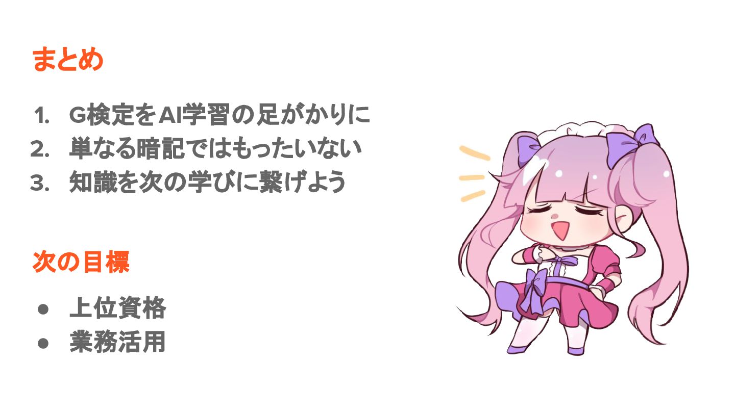 まとめ 1. G検定をAI学習の足がかりに 2. 単なる暗記ではもったいない 3. 知識を次の学びに繋げよう 次の目標 • 上位資格
