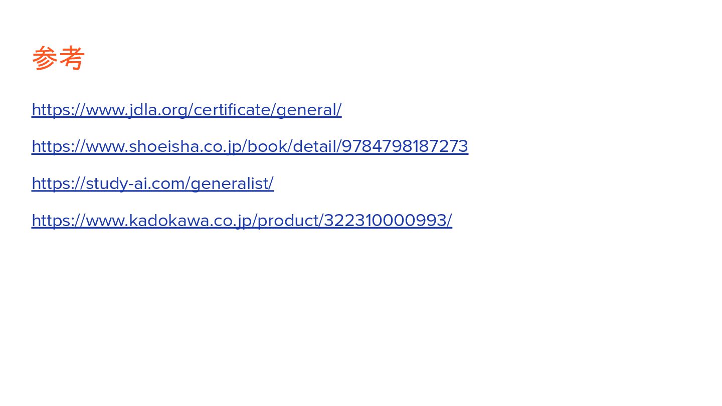 参考 https://www.jdla.org/certificate/general/ https://www.shoeisha.co.jp/book/detail/9784798187273 https://study-ai.com/generalist/ https://www.kadokawa.co.jp/product/322310000993/