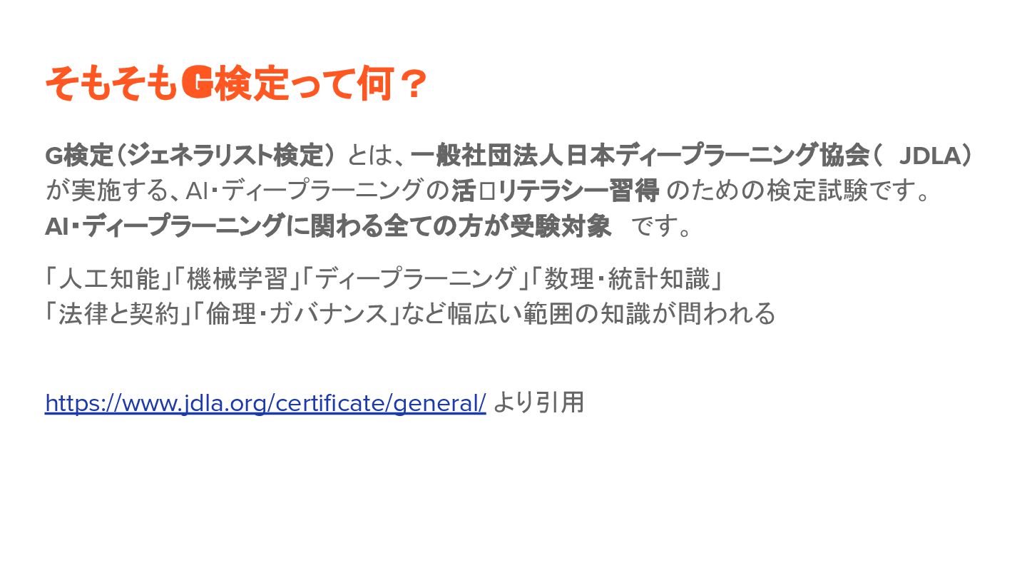 そもそもG検定って何? G検定(ジェネラリスト検定) とは、一般社団法人日本ディープラーニング協会( JDLA) が実施する、AI・ディープラーニングの活⽤リテラシー習得 のための検定試験です。 AI・ディープラーニングに関わる全ての方が受験対象 です。 「人工知能」「機械学習」「ディープラーニング」「数理・統計知識」 「法律と契約」「倫理・ガバナンス」など幅広い範囲の知識が問われる