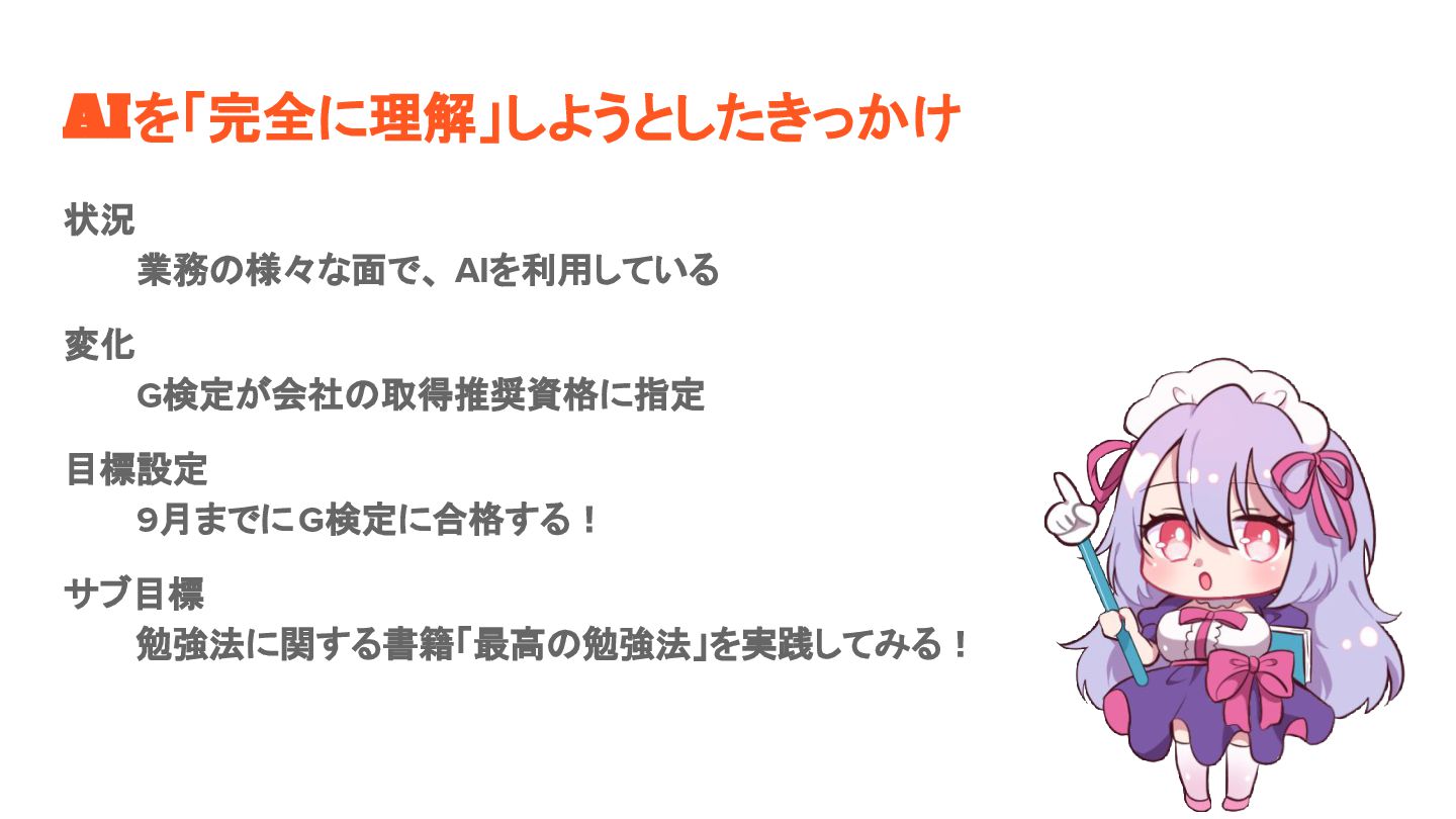 AIを「完全に理解」しようとしたきっかけ 状況 業務の様々な面で、 AIを利用している 変化 G検定が会社の取得推奨資格に指定 目標設定 9月までにG検定に合格する! サブ目標 勉強法に関する書籍「最高の勉強法」を実践してみる!