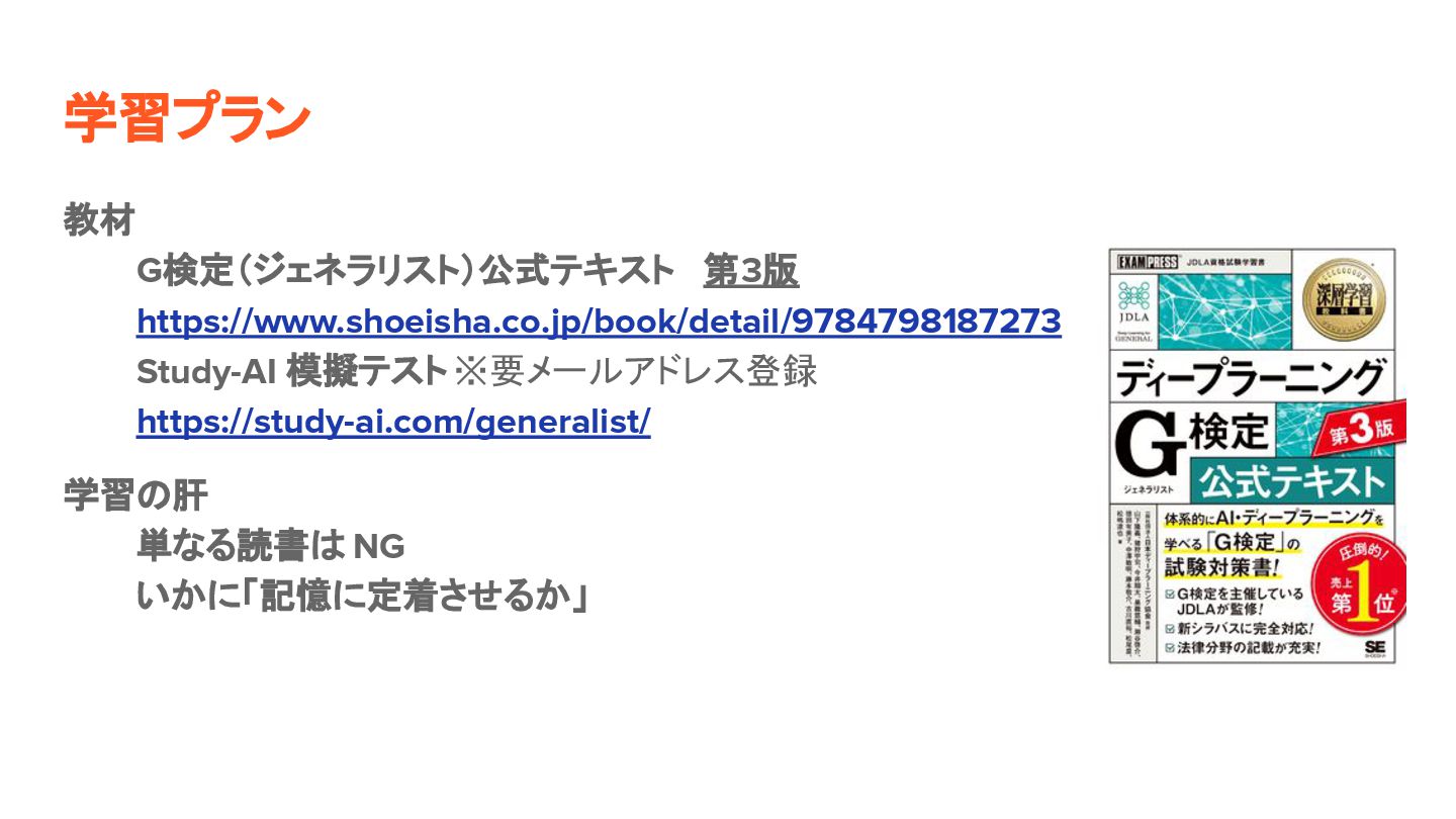 学習プラン 教材 G検定(ジェネラリスト)公式テキスト 第3版 https://www.shoeisha.co.jp/book/detail/9784798187273 Study-AI 模擬テスト ※要メールアドレス登録 https://study-ai.com/generalist/ 学習の肝