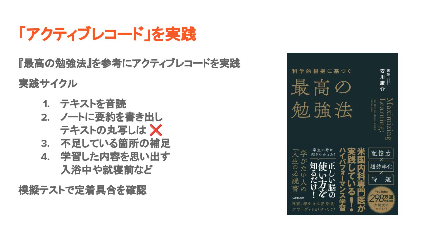 「アクティブレコード」を実践 『最高の勉強法』を参考にアクティブレコードを実践 実践サイクル 1. テキストを音読 2. ノートに要約を書き出し テキストの丸写しは ❌ 3.