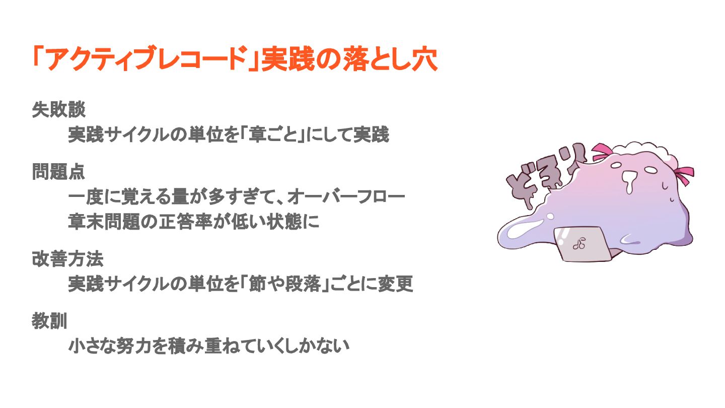 「アクティブレコード」実践の落とし穴 失敗談 実践サイクルの単位を「章ごと」にして実践 問題点 一度に覚える量が多すぎて、オーバーフロー 章末問題の正答率が低い状態に 改善方法 実践サイクルの単位を「節や段落」ごとに変更 教訓 小さな努力を積み重ねていくしかない