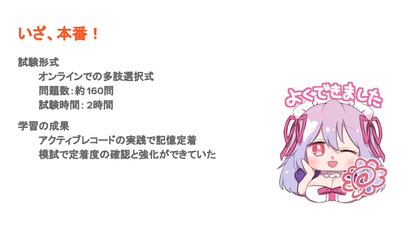 いざ、本番! 試験形式 オンラインでの多肢選択式 問題数:約 160問 試験時間: 2時間 学習の成果 アクティブレコードの実践で記憶定着 模試で定着度の確認と強化ができていた