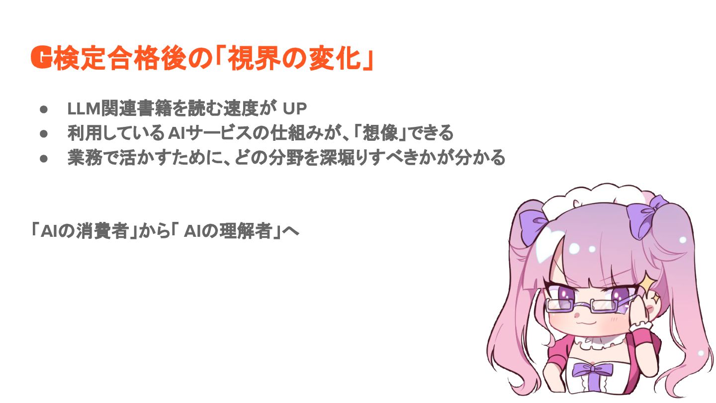 G検定合格後の「視界の変化」 • LLM関連書籍を読む速度が UP • 利用している AIサービスの仕組みが、「想像」できる • 業務で活かすために、どの分野を深堀りすべきかが分かる 「AIの消費者」から「