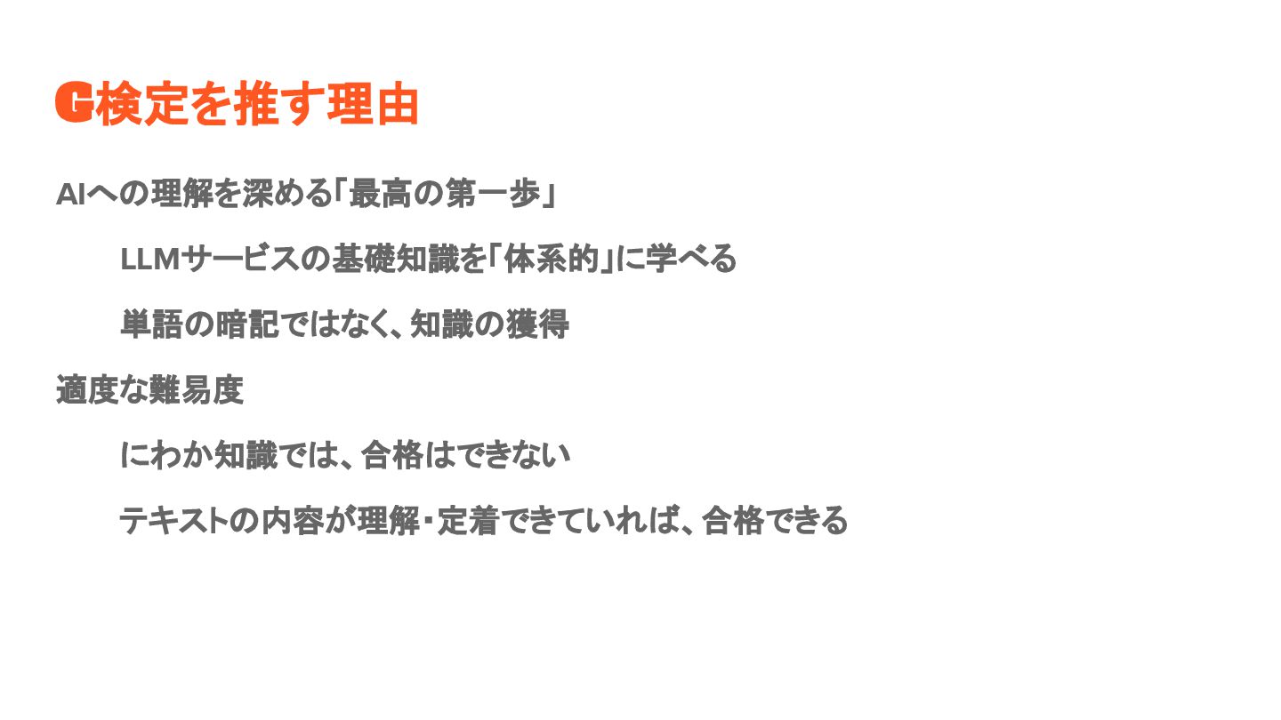 G検定を推す理由 AIへの理解を深める「最高の第一歩」 LLMサービスの基礎知識を「体系的」に学べる 単語の暗記ではなく、知識の獲得 適度な難易度 にわか知識では、合格はできない テキストの内容が理解・定着できていれば、合格できる