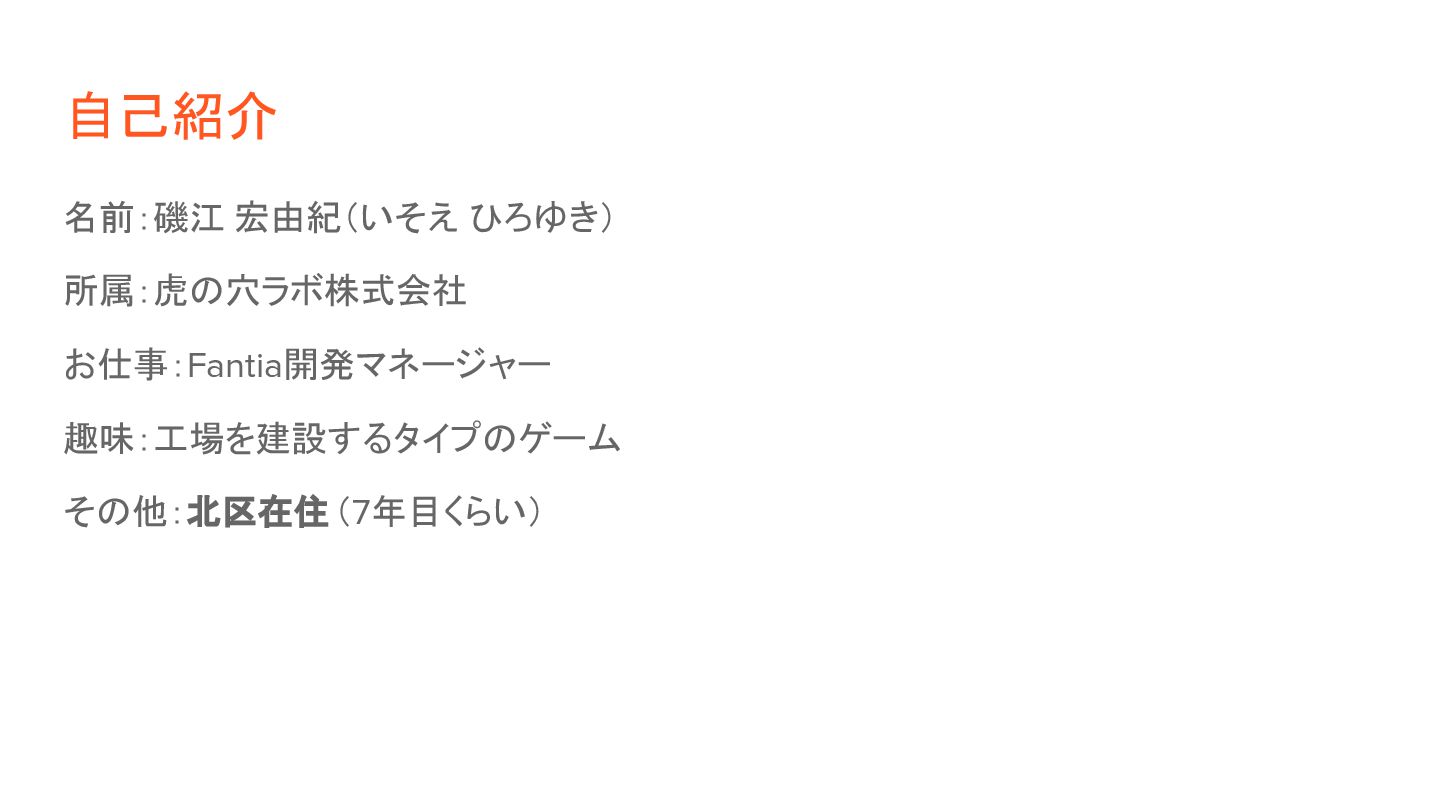 自己紹介 名前:磯江 宏由紀(いそえ ひろゆき) 所属:虎の穴ラボ株式会社 お仕事:Fantia開発マネージャー 趣味:工場を建設するタイプのゲーム その他:北区在住(7年目くらい)