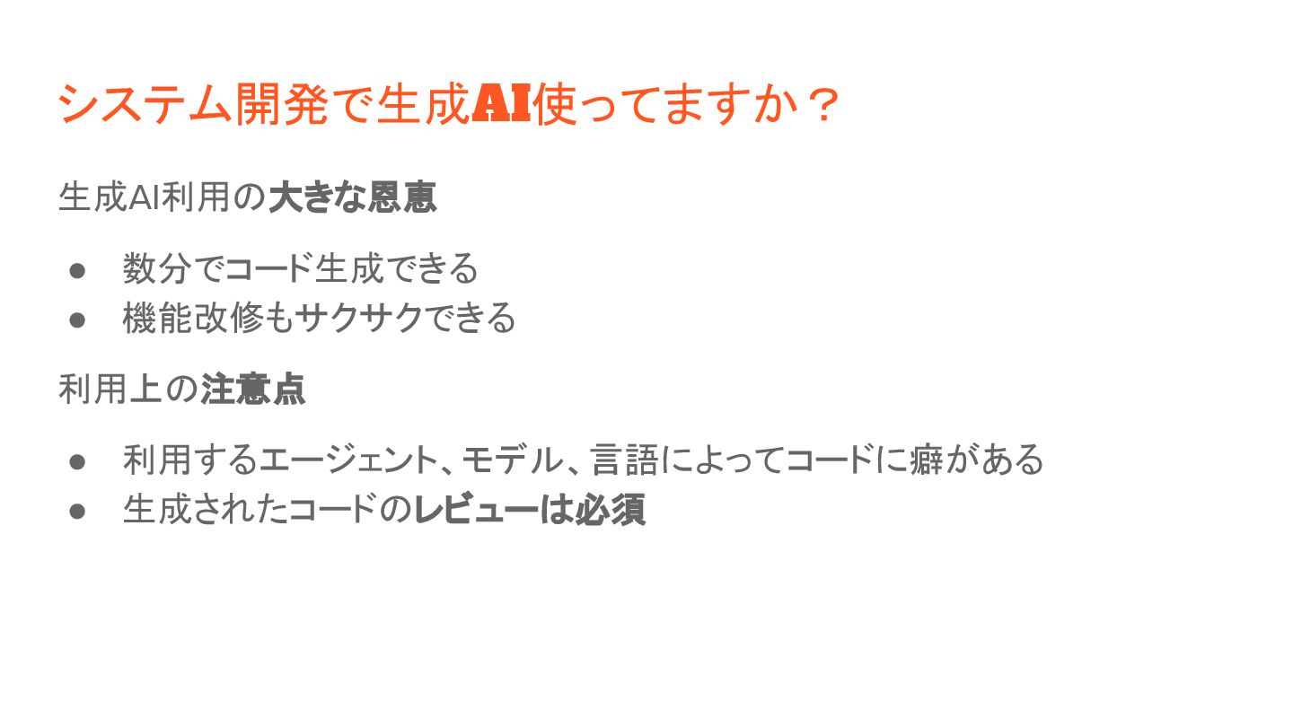 システム開発で生成AI使ってますか? 生成AI利用の大きな恩恵 • 数分でコード生成できる • 機能改修もサクサクできる 利用上の注意点 • 利用するエージェント、モデル、言語によってコードに癖がある •