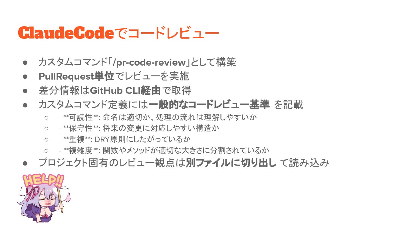 を記載 ◦ - **可読性**: 命名は適切か、処理の流れは理解しやすいか ◦ - **保守性**: 将来の変更に対応しやすい構造か ◦ - **重複**: DRY原則にしたがっているか ◦ - **複雑度**: 関数やメソッドが適切な大きさに分割されているか • プロジェクト固有のレビュー観点は別ファイルに切り出し て読み込み