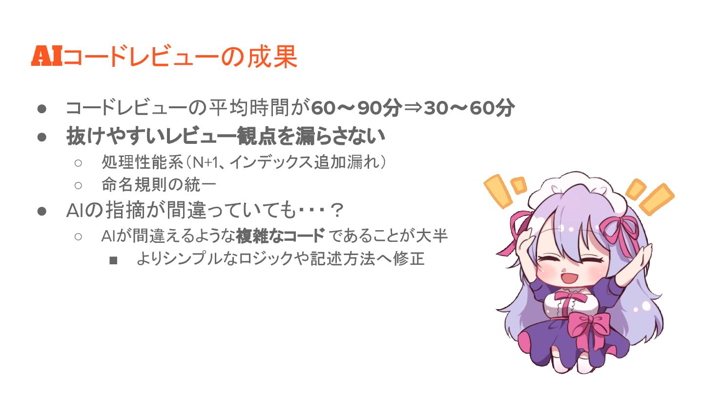 AIコードレビューの成果 • コードレビューの平均時間が60〜90分⇒30〜60分 • 抜けやすいレビュー観点を漏らさない ◦ 処理性能系(N+1、インデックス追加漏れ) ◦ 命名規則の統一 •