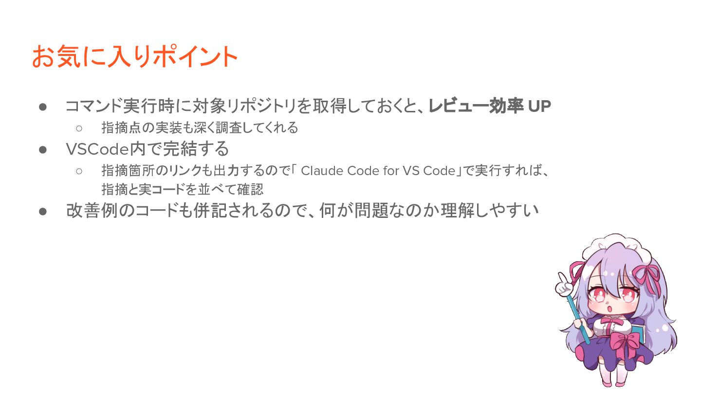 お気に入りポイント • コマンド実行時に対象リポジトリを取得しておくと、レビュー効率 UP ◦ 指摘点の実装も深く調査してくれる • VSCode内で完結する ◦ 指摘箇所のリンクも出力するので「