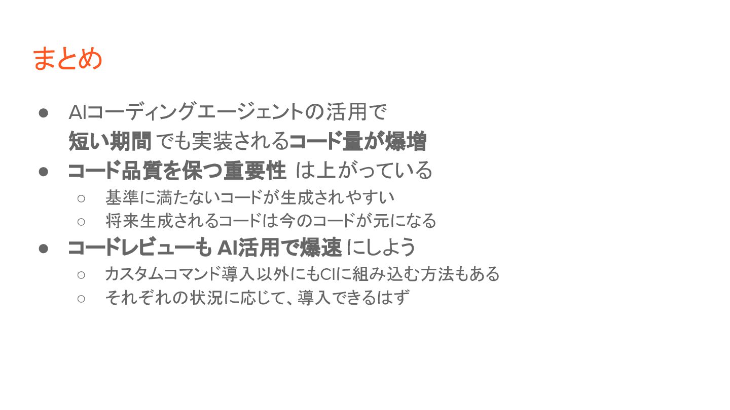 将来生成されるコードは今のコードが元になる • コードレビューも AI活用で爆速 にしよう ◦ カスタムコマンド導入以外にもCIに組み込む方法もある ◦ それぞれの状況に応じて、導入できるはず