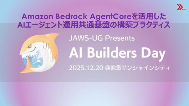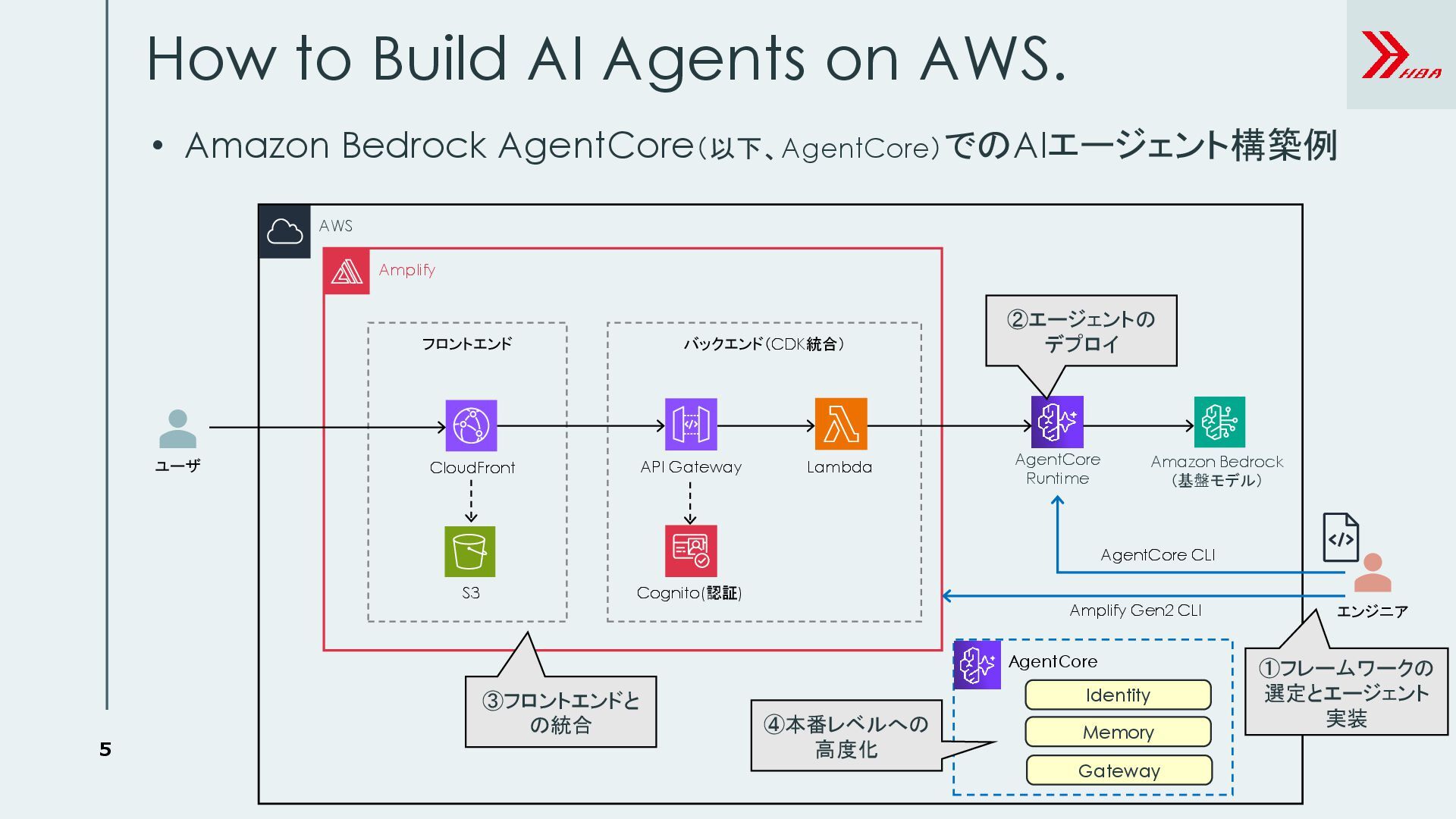 AWS. CloudFront S3 API Gateway Lambda Cognito(認証) フロントエンド バックエンド(CDK統合) AgentCore Runtime Amazon Bedrock (基盤モデル) エンジニア AgentCore CLI Amplify Gen2 CLI • Amazon Bedrock AgentCore(以下、AgentCore)でのAIエージェント構築例 ②エージェントの デプロイ ③フロントエンドと の統合 AgentCore Identity Memory Gateway ④本番レベルへの 高度化 ①フレームワークの 選定とエージェント 実装