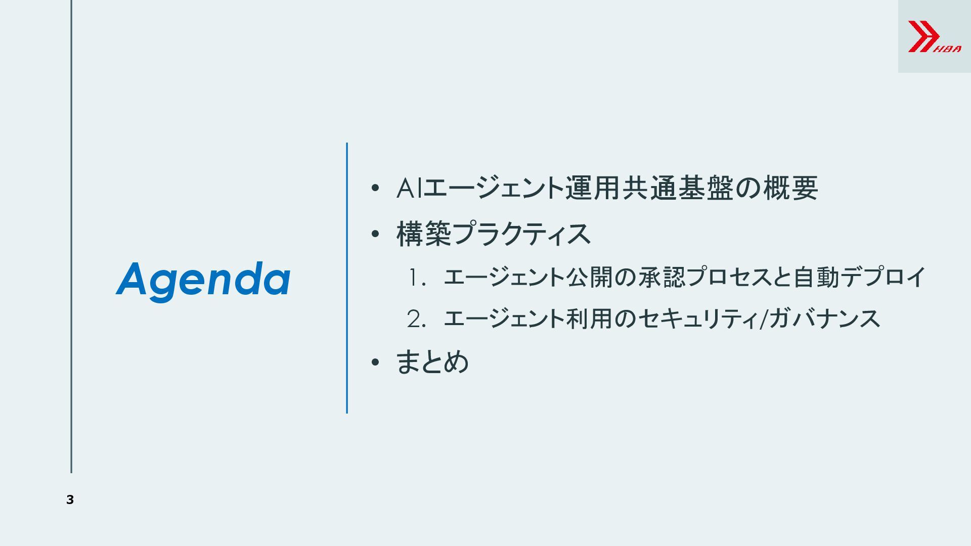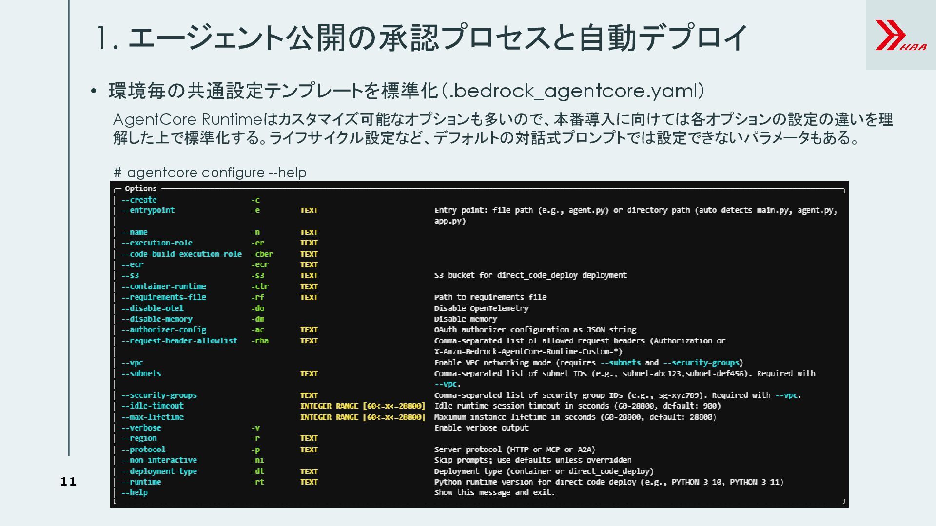 11. まとめ ⚫ AIエージェント運用共通基盤が目指すこと ➢ 誰でも簡単にエージェントを構築・公開できる ➢ エージェントを安全に利用できる ⚫ 構築プラクティス 1.