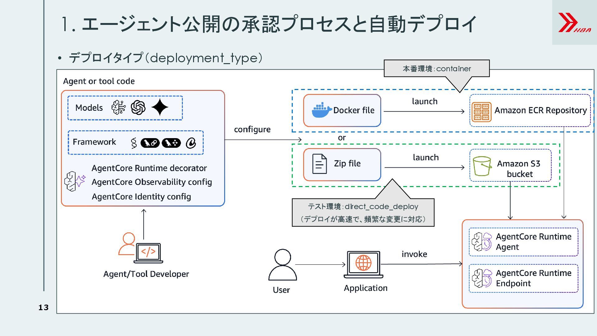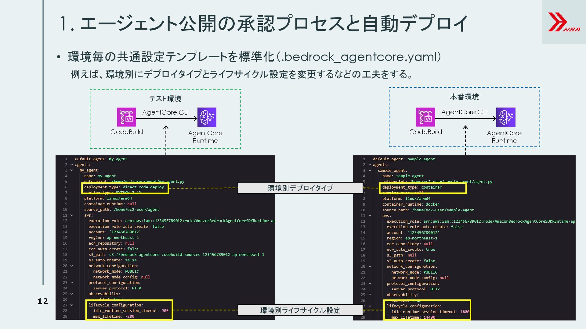 5. 12 • 環境毎の共通設定テンプレートを標準化(.bedrock_agentcore.yaml) 1. エージェント公開の承認プロセスと自動デプロイ CodeBuild AgentCore Runtime テスト環境 AgentCore