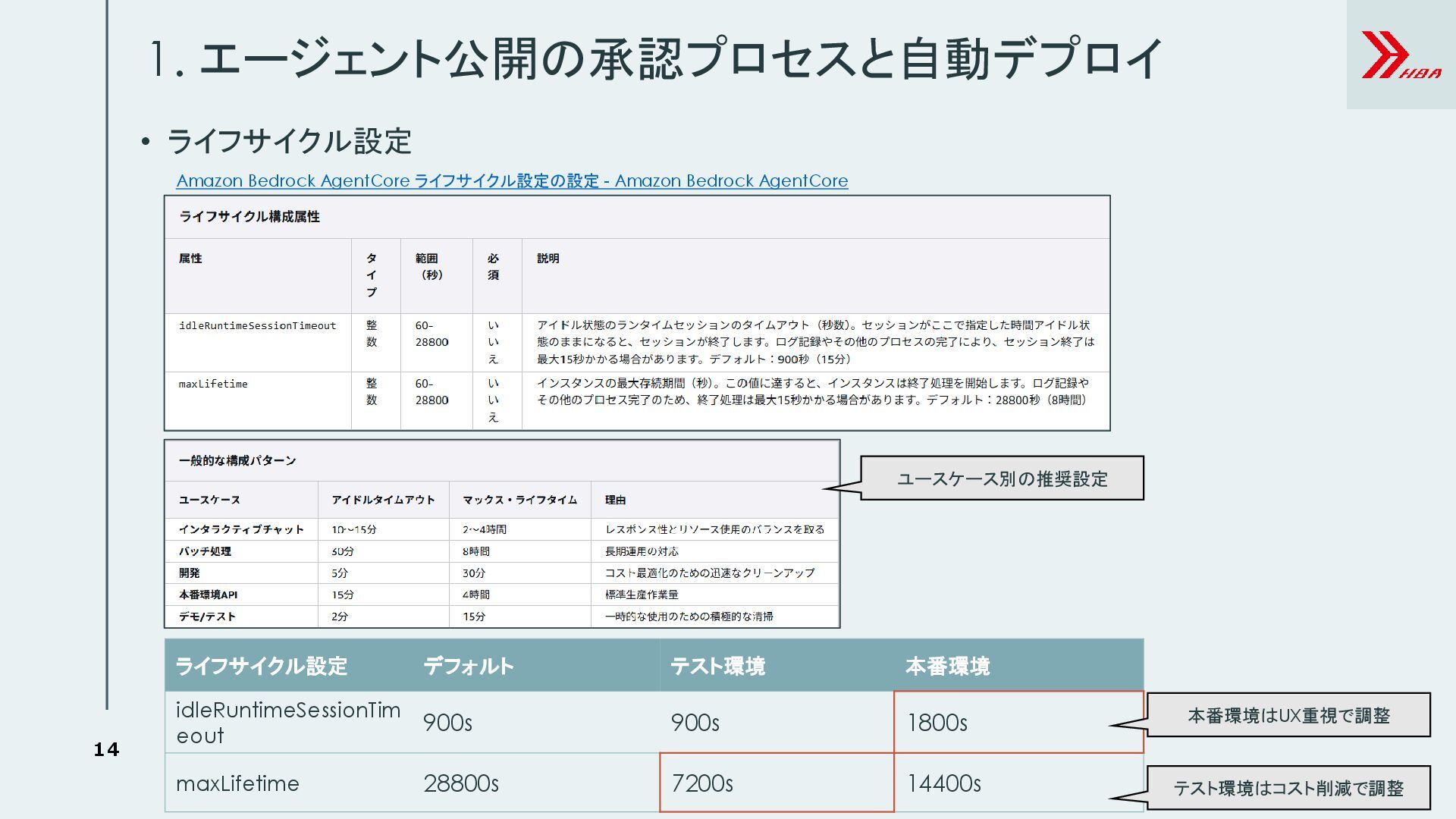 6. 14 1. エージェント公開の承認プロセスと自動デプロイ • ライフサイクル設定 Amazon Bedrock AgentCore ライフサイクル設定の設定 -