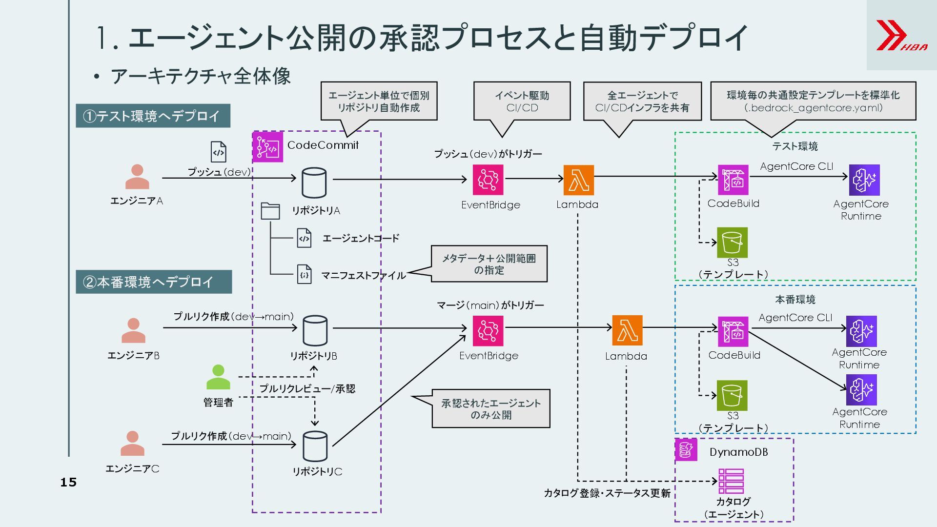 DynamoDB カタログ (エージェント) CodeCommit リポジトリA リポジトリB AgentCore Runtime 管理者 EventBridge CodeBuild Lambda AgentCore Runtime 本番環境 テスト環境 プッシュ(dev) プルリク作成(dev→main) マージ(main)がトリガー プルリクレビュー/承認 ①テスト環境へデプロイ ②本番環境へデプロイ エージェント単位で個別 リポジトリ自動作成 AgentCore CLI AgentCore CLI プッシュ(dev)がトリガー カタログ登録・ステータス更新 イベント駆動 CI/CD 環境毎の共通設定テンプレートを標準化 (.bedrock_agentcore.yaml) リポジトリC エンジニアC プルリク作成(dev→main) AgentCore Runtime 全エージェントで CI/CDインフラを共有 承認されたエージェント のみ公開 S3 (テンプレート) S3 (テンプレート) エージェントコード マニフェストファイル メタデータ+公開範囲 の指定