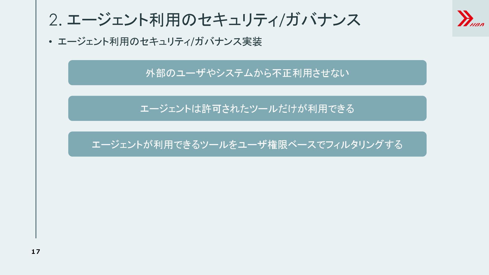 9. 19 2. エージェント利用のセキュリティ/ガバナンス • 外部のユーザやシステムから不正利用させない(ツール) • エージェントは許可されたツールだけが利用できる • エージェントのIAMロールに直接ツールへの権限を与えない。 •