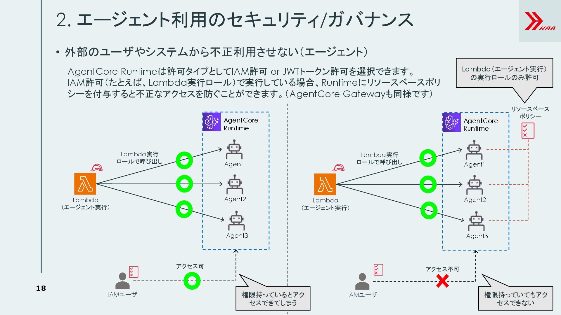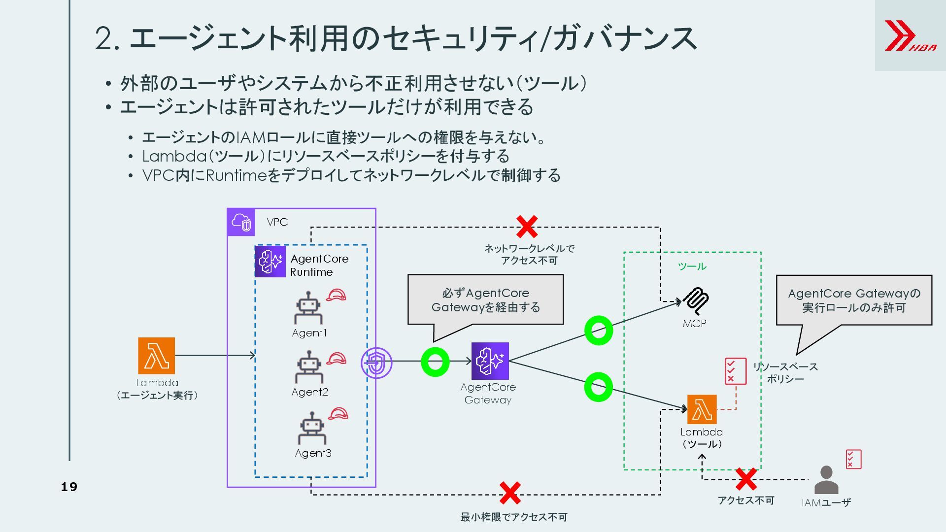 8. 18 • 外部のユーザやシステムから不正利用させない(エージェント) 2. エージェント利用のセキュリティ/ガバナンス Lambda (エージェント実行) IAMユーザ アクセス可 Lambda実行