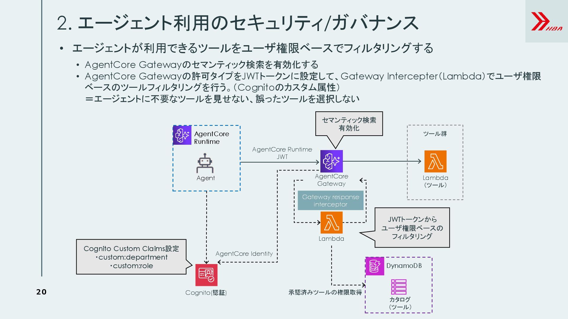 10. 20 2. エージェント利用のセキュリティ/ガバナンス • エージェントが利用できるツールをユーザ権限ベースでフィルタリングする AgentCore Gateway Lambda (ツール) セマンティック検索