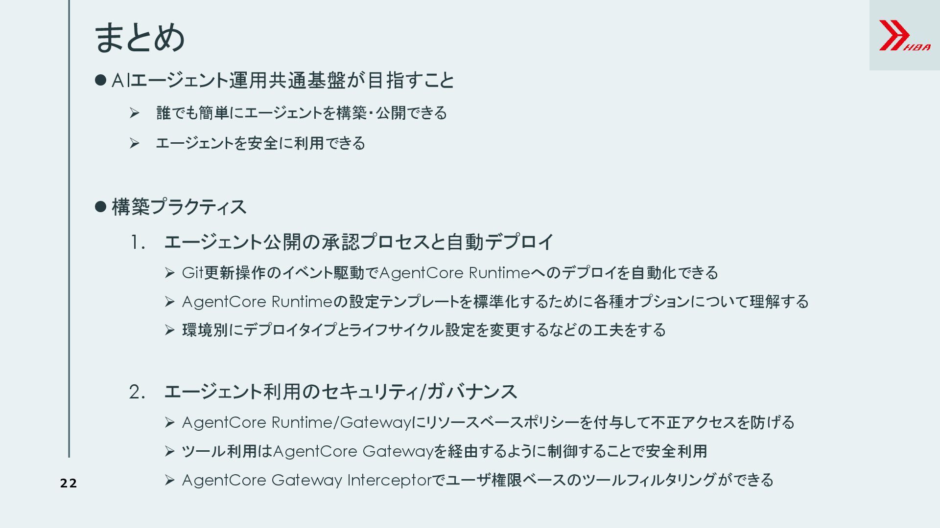 エージェント公開の承認プロセスと自動デプロイ ➢ Git更新操作のイベント駆動でAgentCore Runtimeへのデプロイを自動化できる ➢ AgentCore Runtimeの設定テンプレートを標準化するために各種オプションについて理解する ➢ 環境別にデプロイタイプとライフサイクル設定を変更するなどの工夫をする 2. エージェント利用のセキュリティ/ガバナンス ➢ AgentCore Runtime/Gatewayにリソースベースポリシーを付与して不正アクセスを防げる ➢ ツール利用はAgentCore Gatewayを経由するように制御することで安全利用 ➢ AgentCore Gateway Interceptorでユーザ権限ベースのツールフィルタリングができる 22
