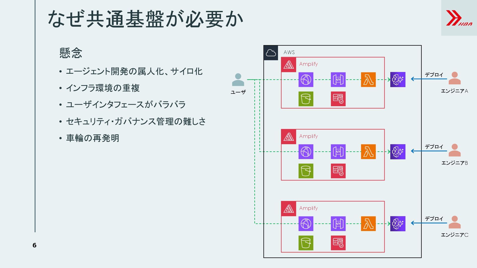 2. 6 なぜ共通基盤が必要か AWS Amplify エンジニアA デプロイ Amplify エンジニアB デプロイ Amplify