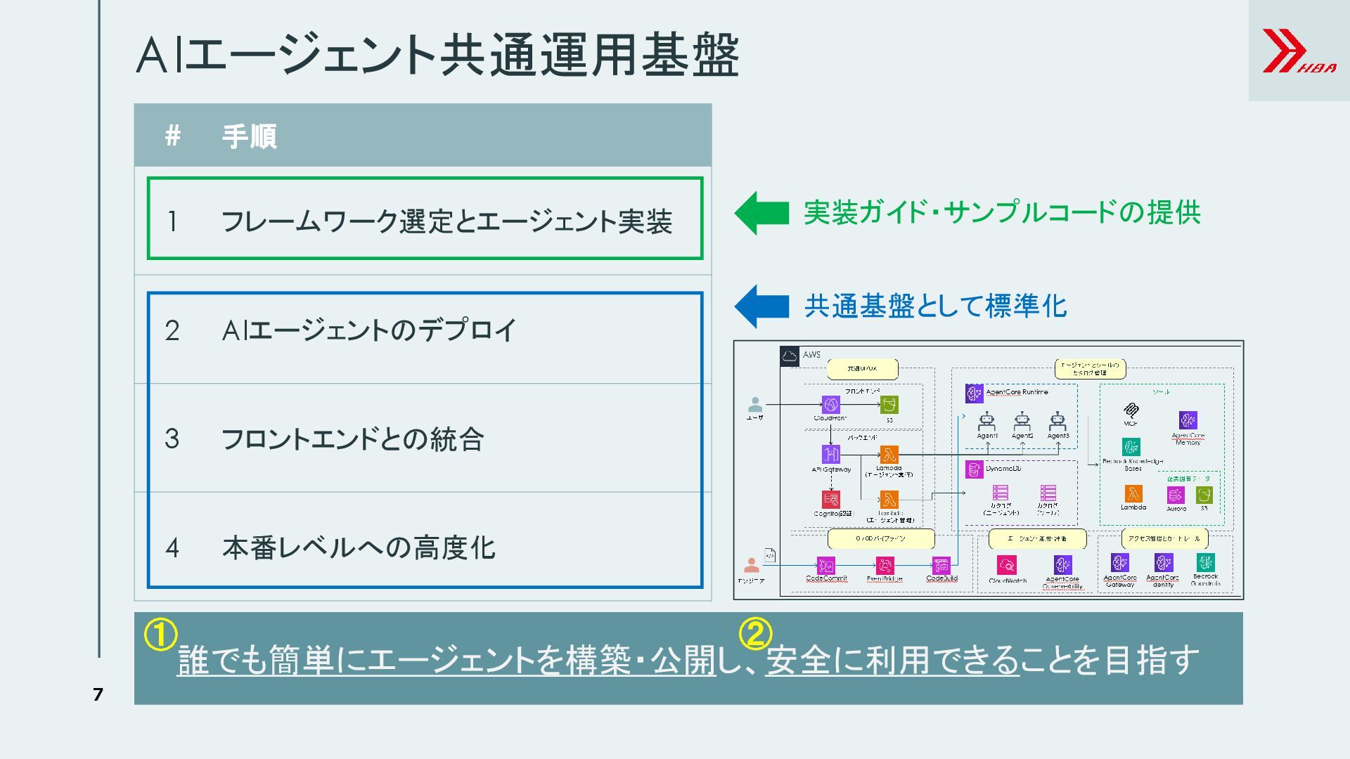 4 本番レベルへの高度化 実装ガイド・サンプルコードの提供 共通基盤として標準化 誰でも簡単にエージェントを構築・公開し、安全に利用できることを目指す ① ②