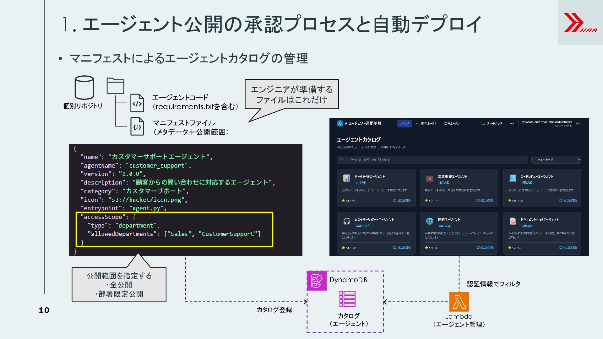 4. 10 • マニフェストによるエージェントカタログの管理 1. エージェント公開の承認プロセスと自動デプロイ DynamoDB カタログ (エージェント) カタログ登録 エージェントコード