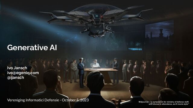 AI Vereniging Informatici Defensie - October 5, 2023 Midjourney - "a symposium for ministry of defense staff, with drones in attendance, sci-fi movie style" Ivo Jansch [email protected] @ijansch