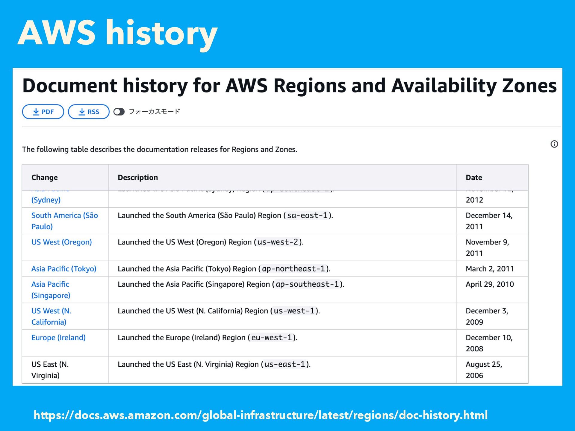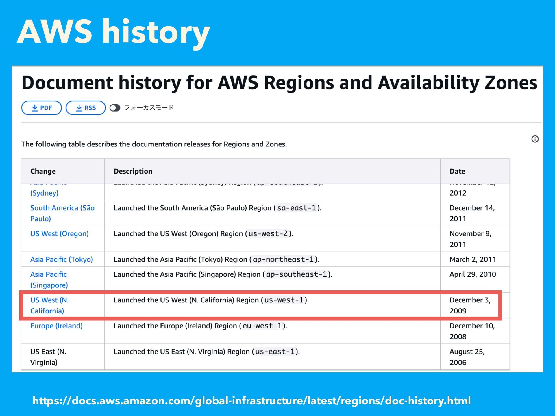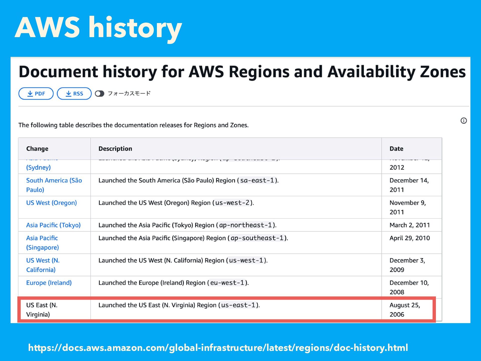 AWS history https://docs.aws.amazon.com/global-infrastructure/latest/regions/doc-history.html