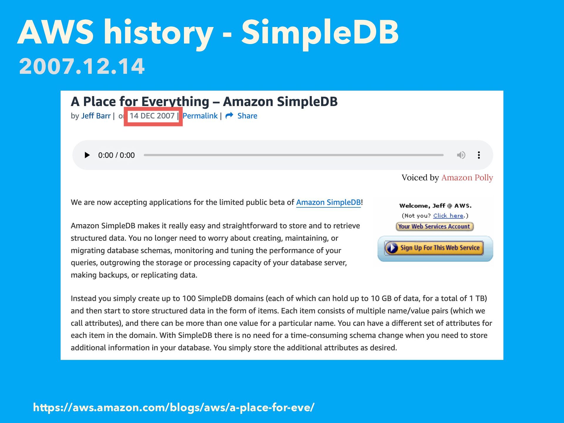 AWS history - SimpleDB https://aws.amazon.com/blogs/aws/a-place-for-eve/ 2007.12.14