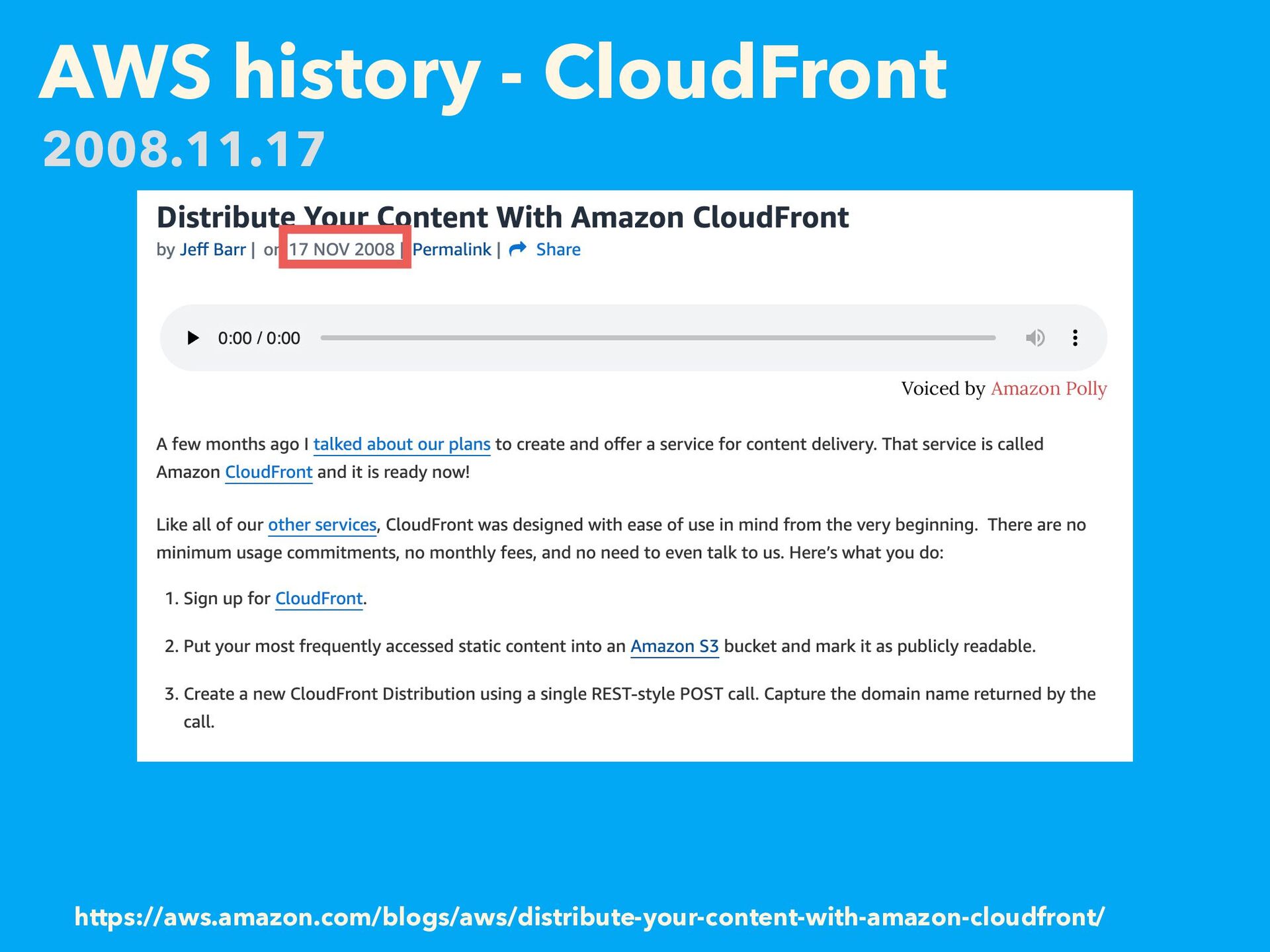 AWS history - CloudFront https://aws.amazon.com/blogs/aws/distribute-your-content-with-amazon-cloudfront/ 2008.11.17