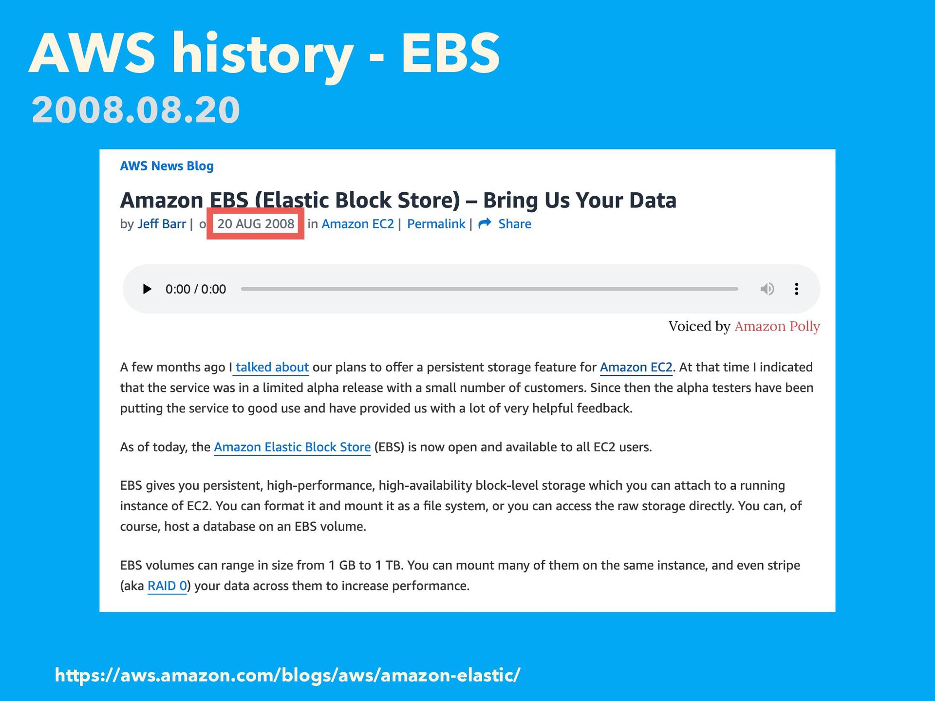 AWS history - EBS https://aws.amazon.com/blogs/aws/amazon-elastic/ 2008.08.20