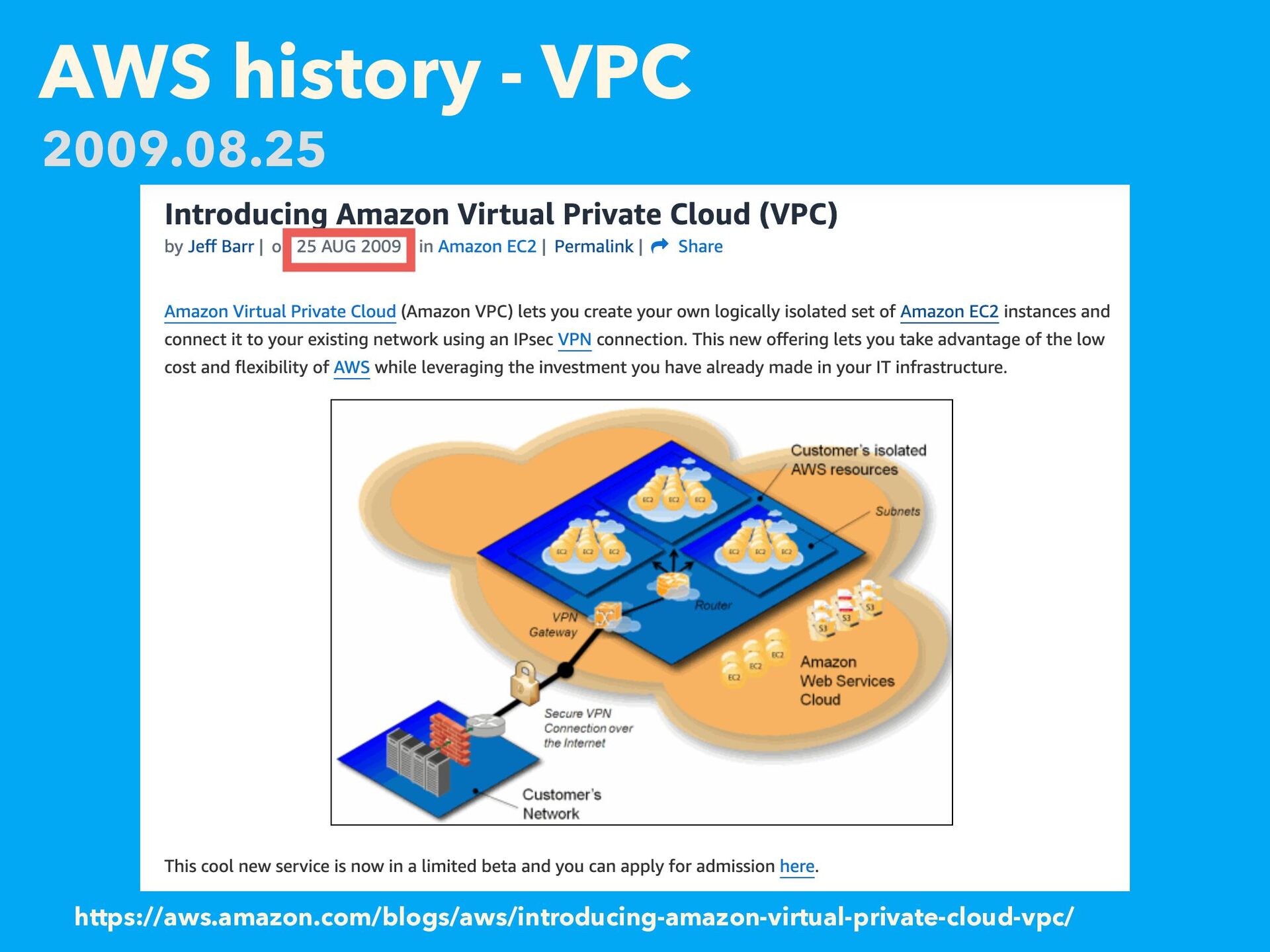 AWS history - VPC https://aws.amazon.com/blogs/aws/introducing-amazon-virtual-private-cloud-vpc/ 2009.08.25