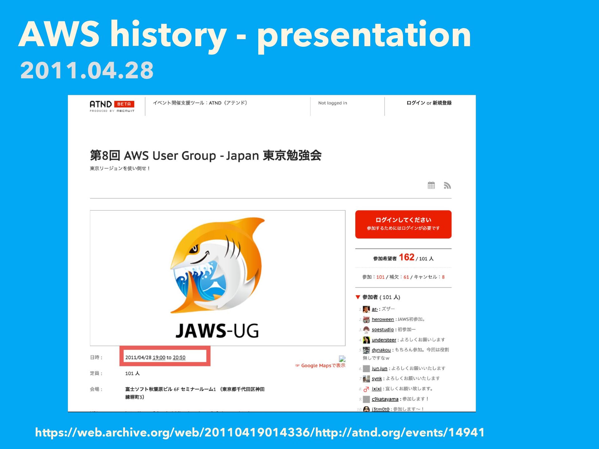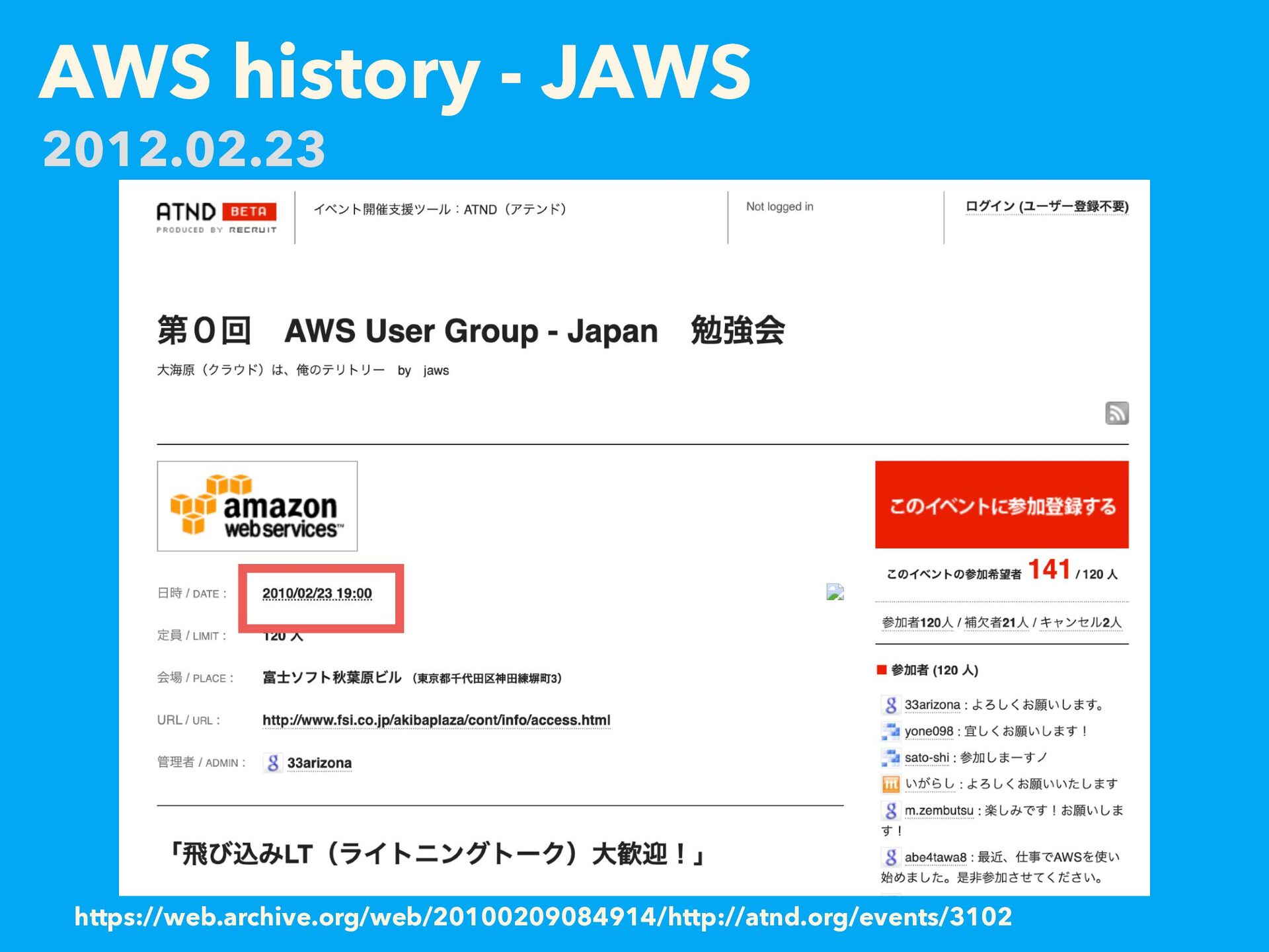 AWS history - JAWS https://web.archive.org/web/20100209084914/http://atnd.org/events/3102 2012.02.23