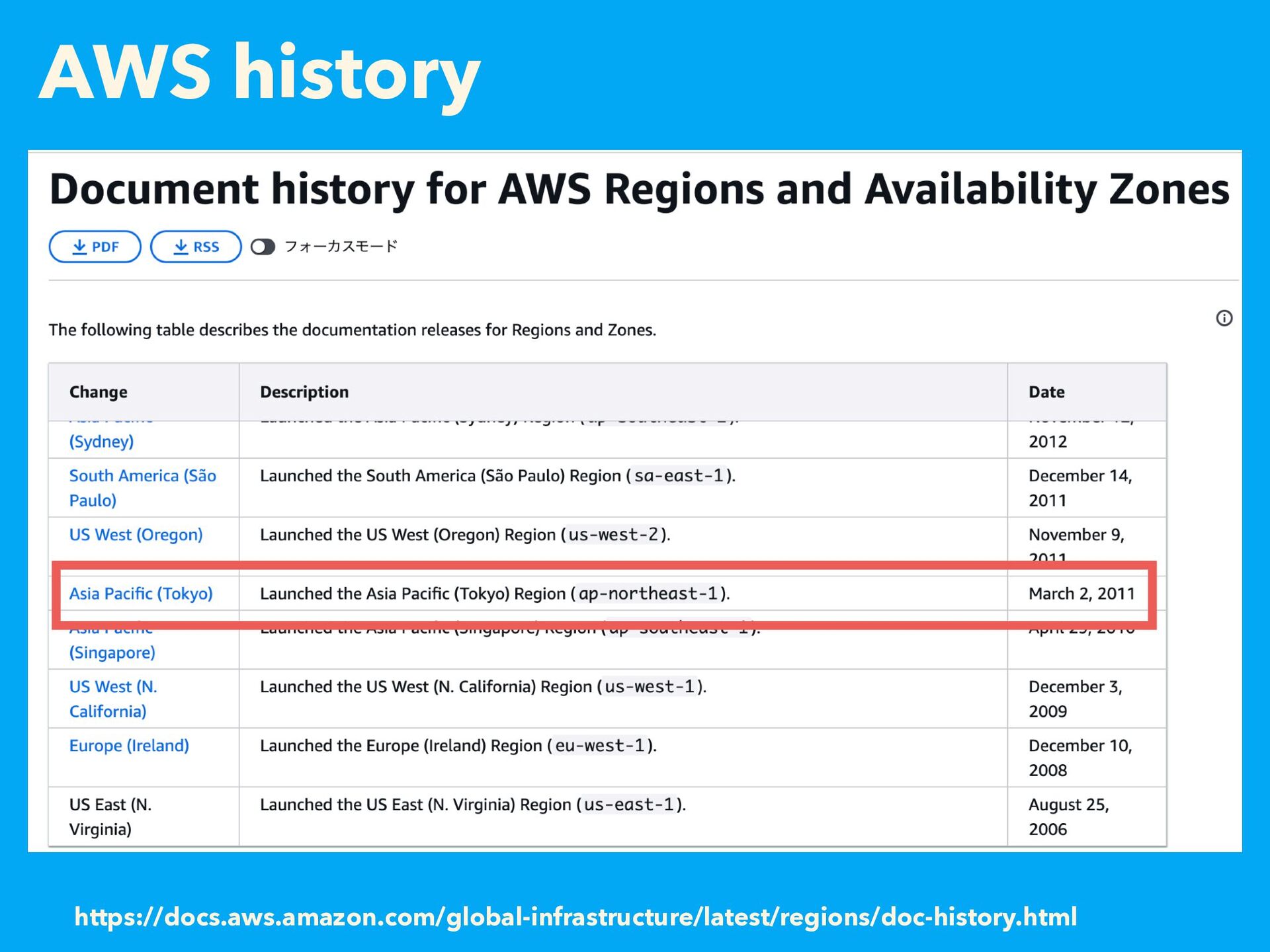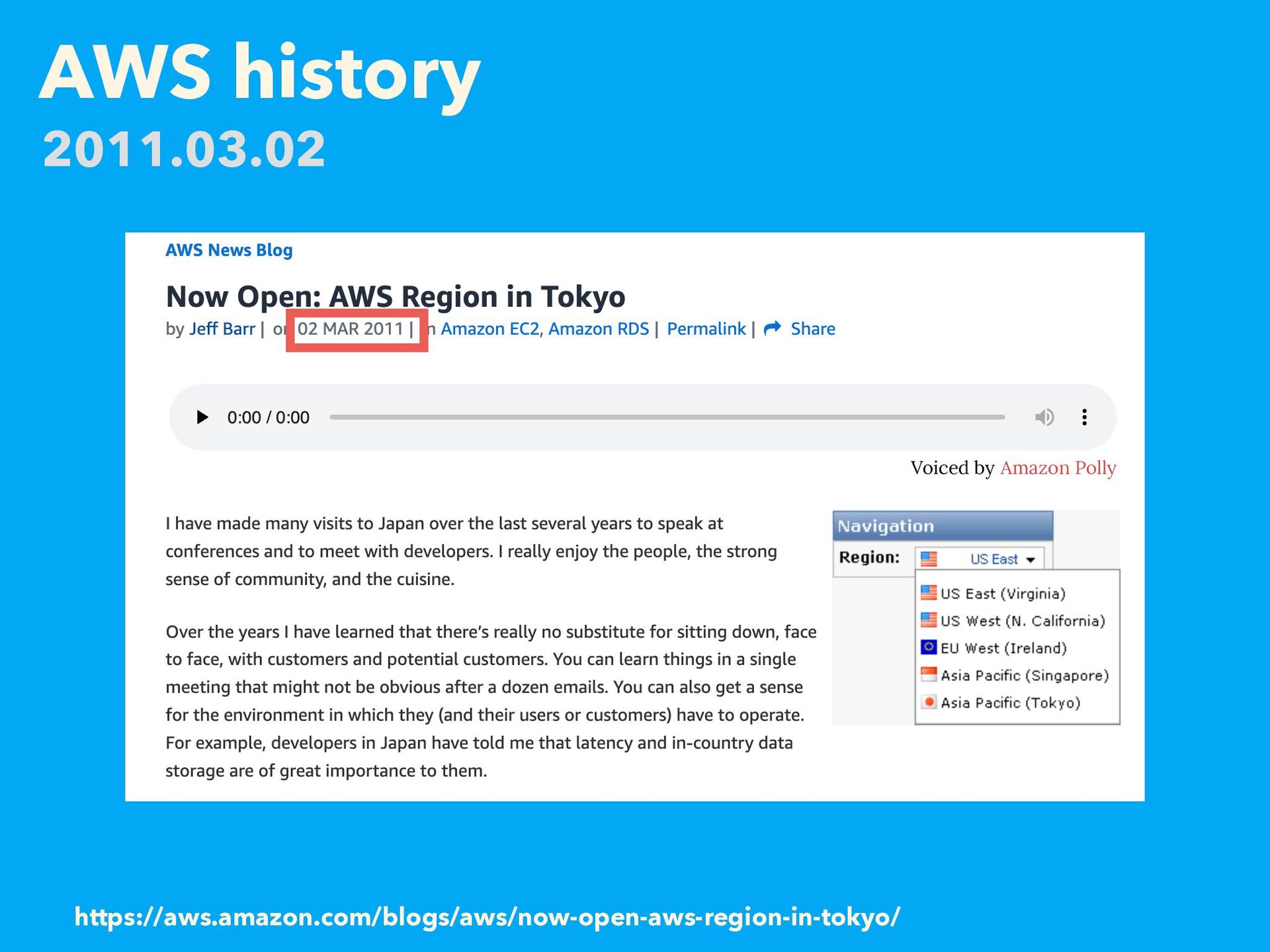 AWS history https://aws.amazon.com/blogs/aws/now-open-aws-region-in-tokyo/ 2011.03.02